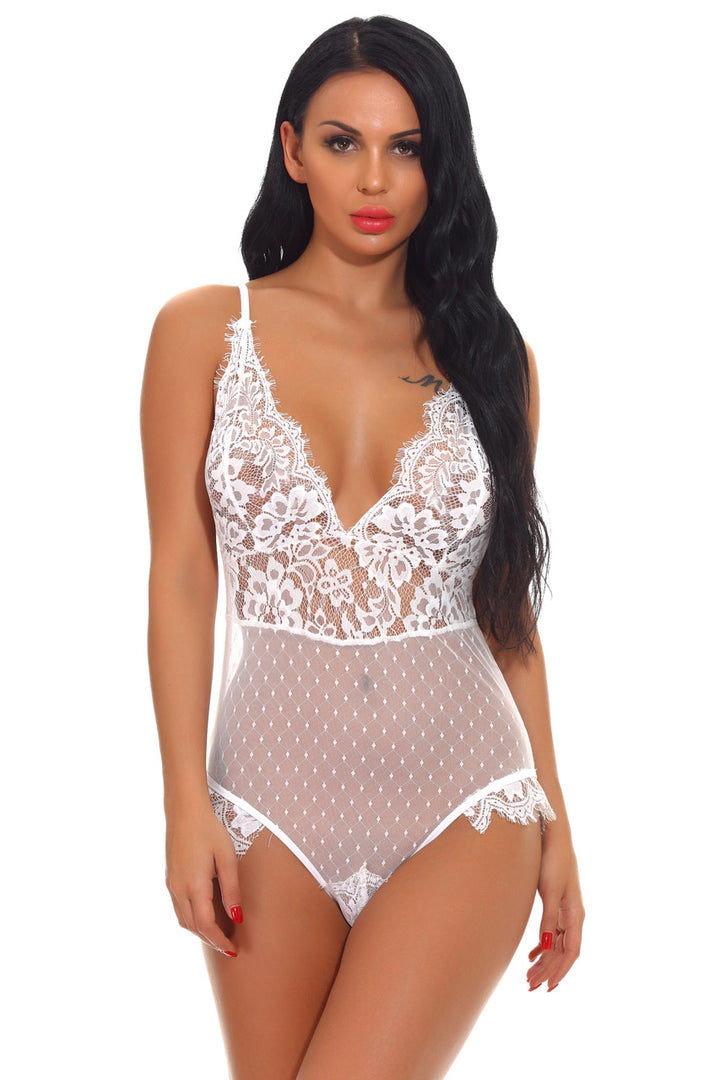 This romantic teddy lingerie features delicate, eyelash lace, dotted mesh bottom, eyelash lace trim, and a cheeky cut back.