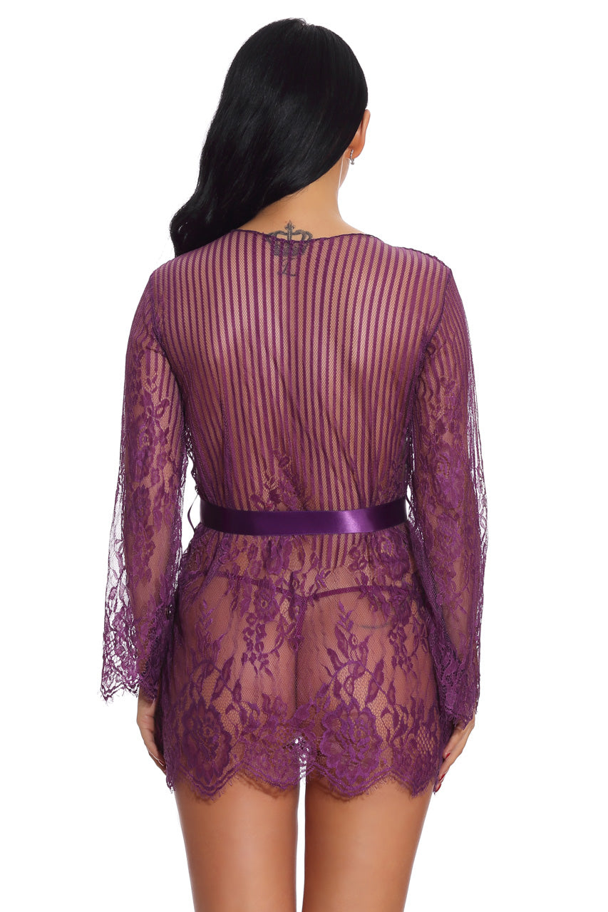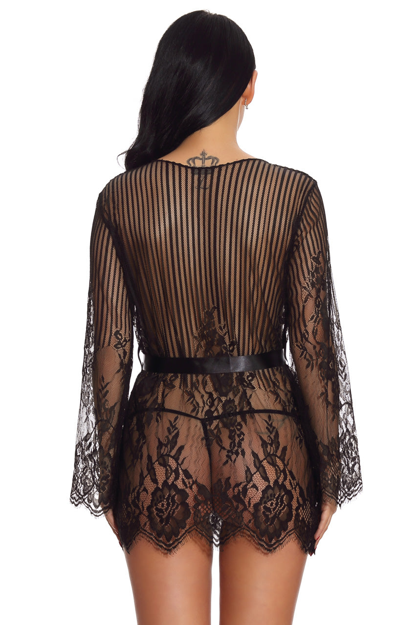 This striped mesh and floral lace robe features a satin belted middle and eyelash lace trim.