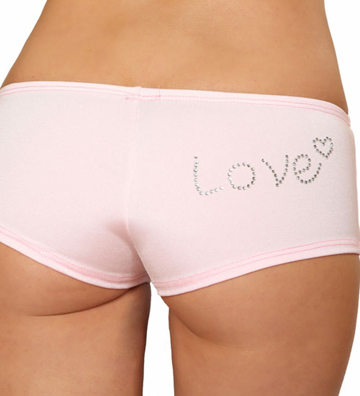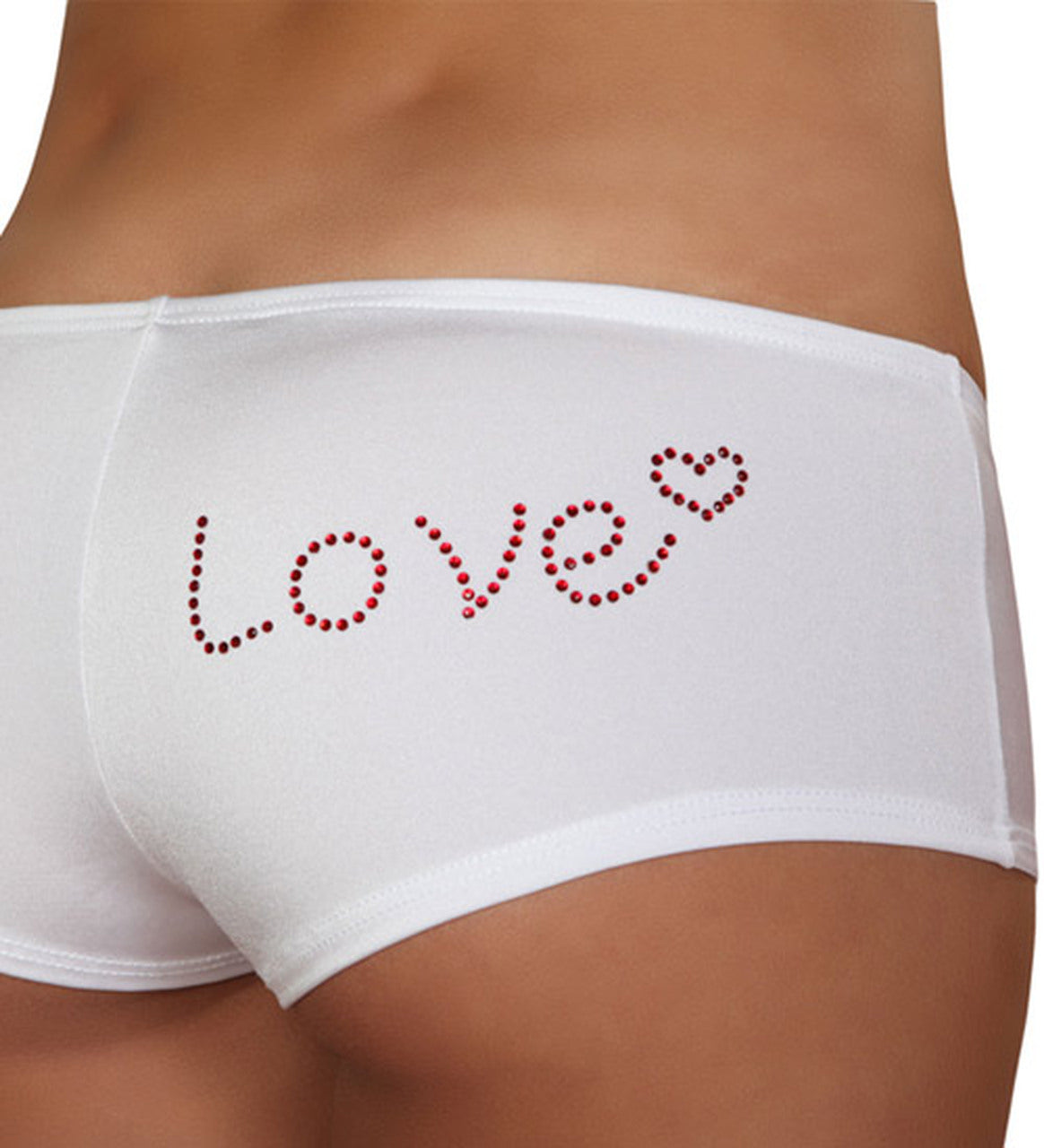 These sexy boy shorts with Rhinestone "Love" and Heart emblazoned on the back will surely turn some heads at the party or event you are attending. Those lusting after what is underneath the shorts will want to experience your lovin' and give you their heart, if only for the evening. Your sexy body will be highlighted with such minimal clothed areas that those around you will want to come over to get a closer look and shield you from other lustful eyes . This sexy number is made in USA of quality materials and will be sure to satisfy both the wearer and those gawking at the wearer.