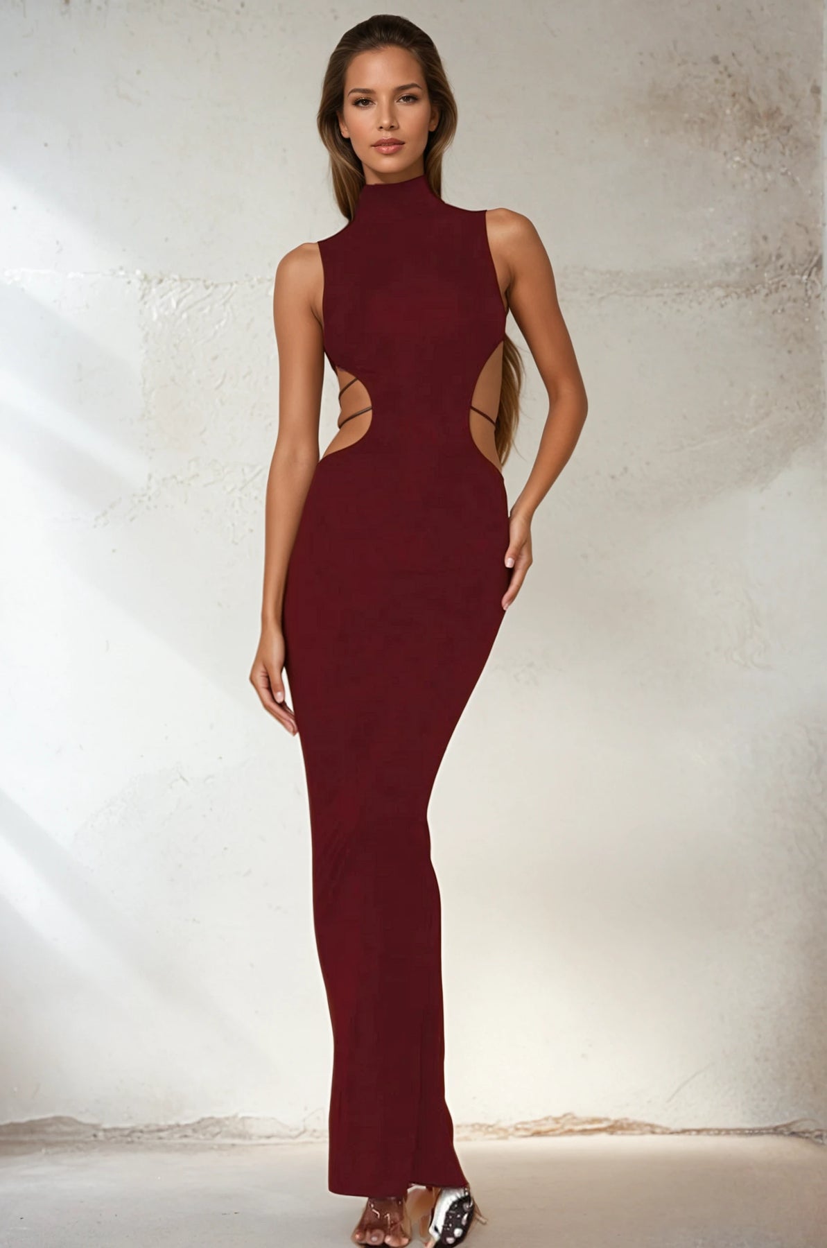This floor length, form fitting dress features a high cut neck, and a wide open back with criss cross jeweled straps.