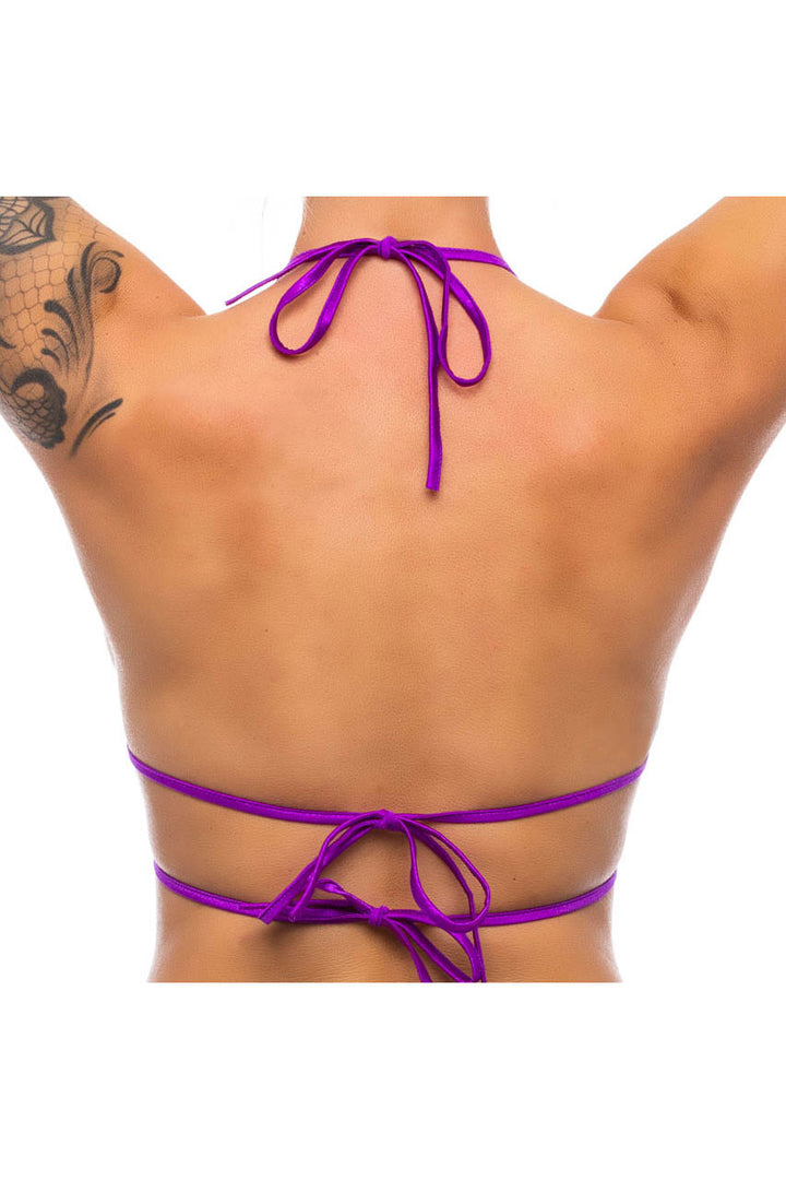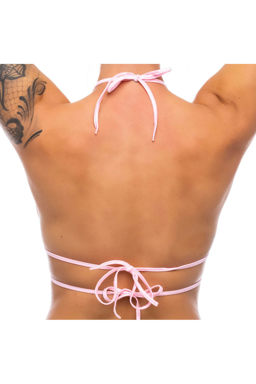 This lycra Tiffany top features mini triangle cups with strappy details, O-ring center, and extra long ties for wrapping.
