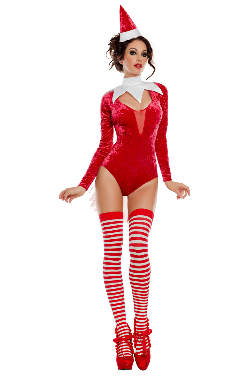 This Santa's Shelf Helper costume includes a red velvet bodysuit with long sleeves, mesh inset bust, attached ruffled bustle skirt, white collar and hat. (Stockings not included.)