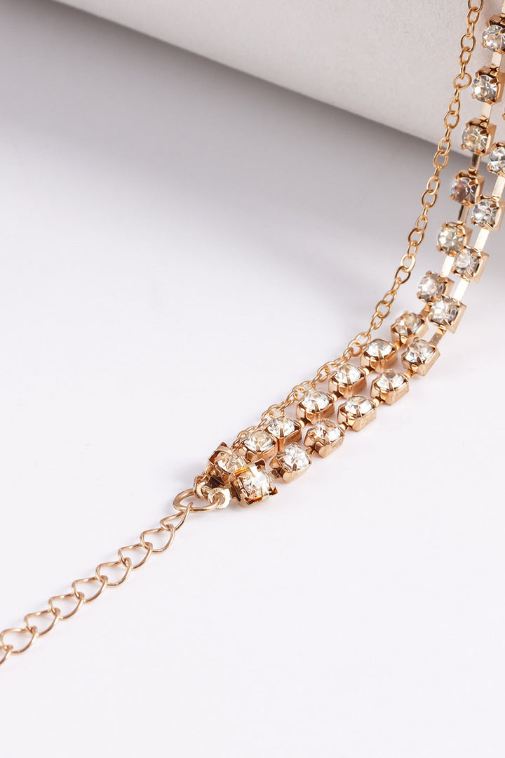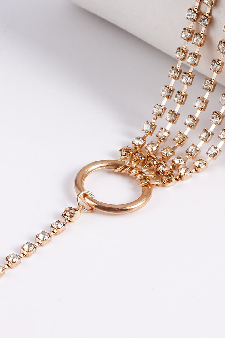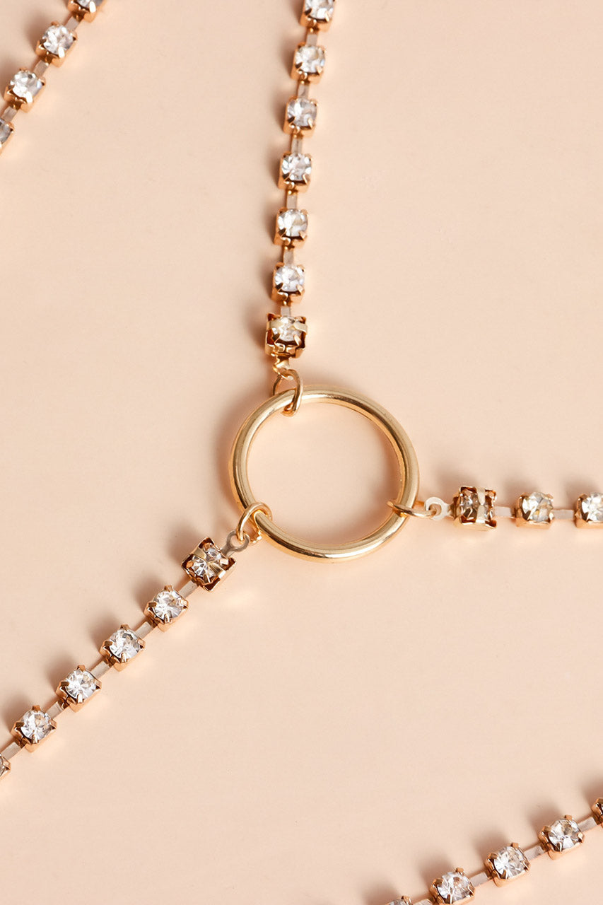 This draped harness body jewelry features an O-ring mid-bust detail.