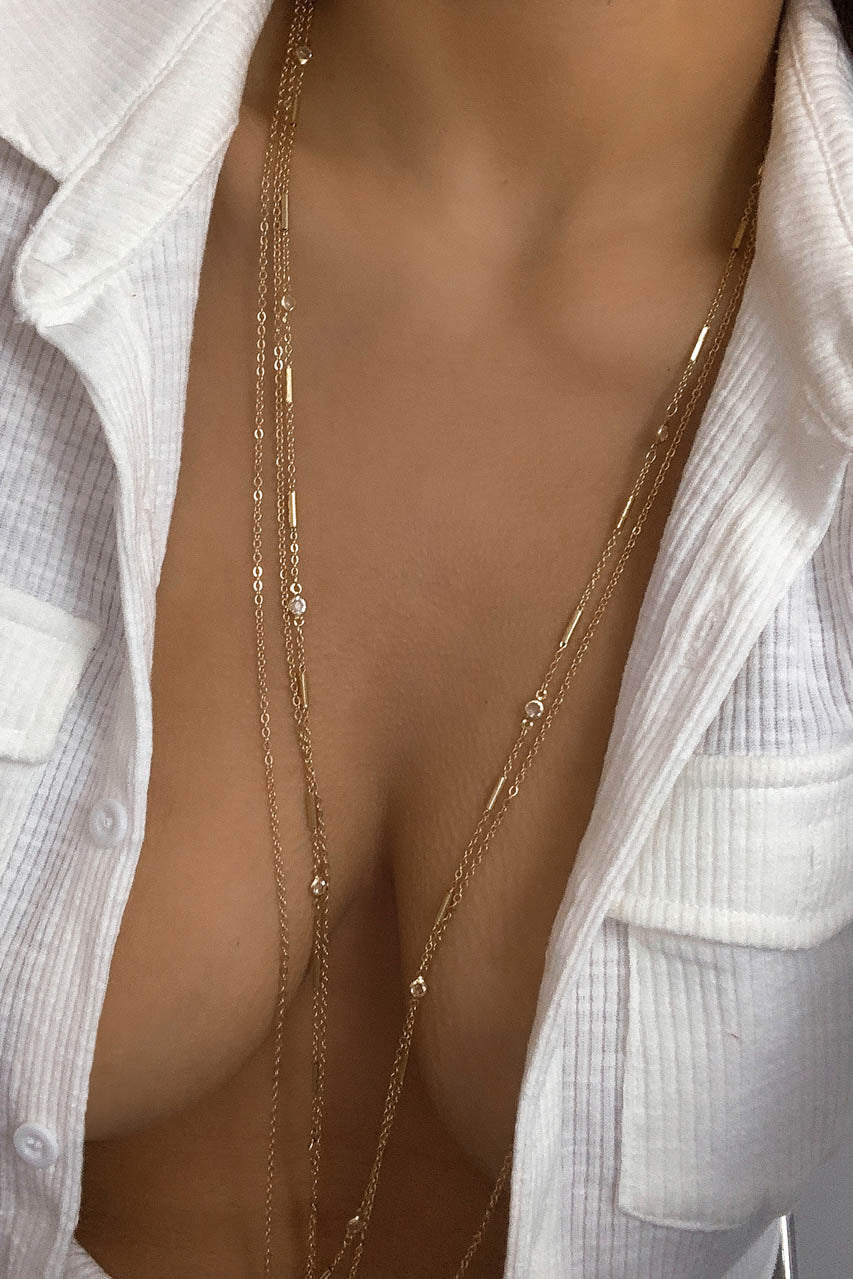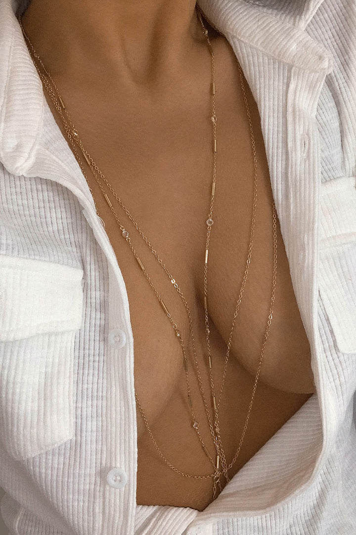 This gold, double loop body chain features a charm middle and dual clasp closure.