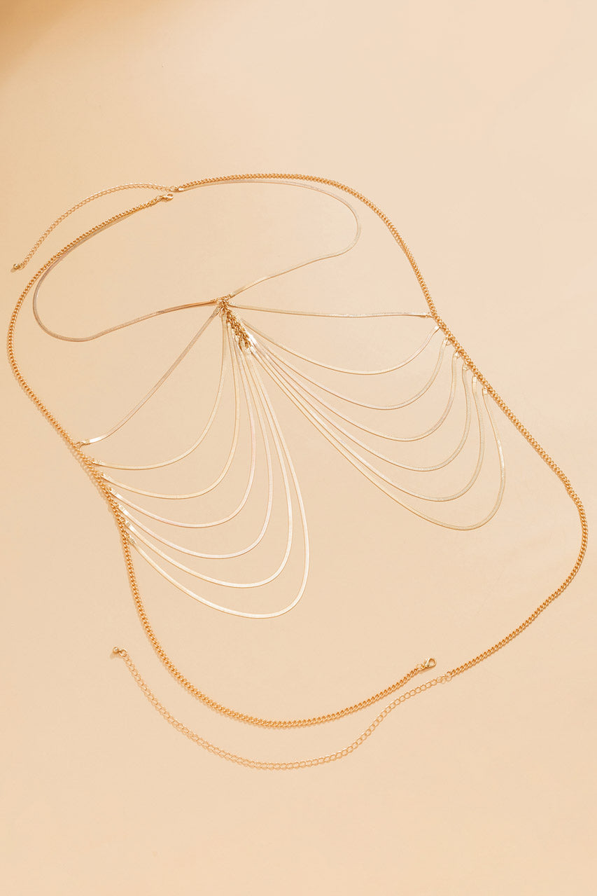 This gold chain body jewelry features multiplied draped chain straps and clasp closure.