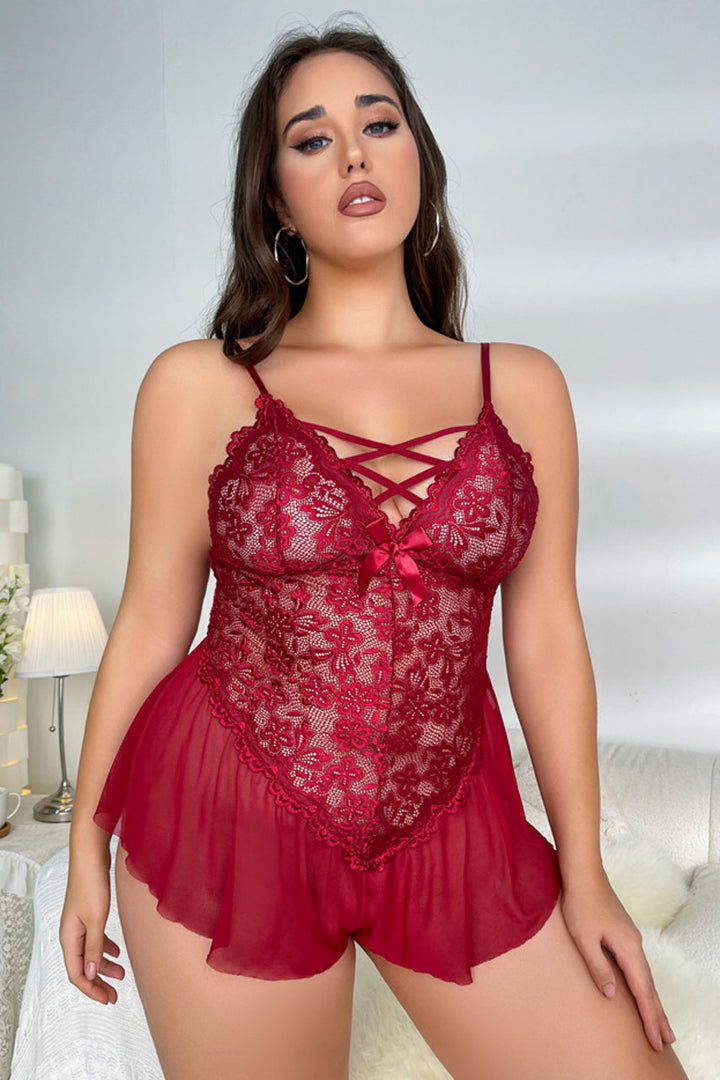 This plus size lace teddy features flutter mesh hips, a lace-up bust, and spaghetti shoulder straps.