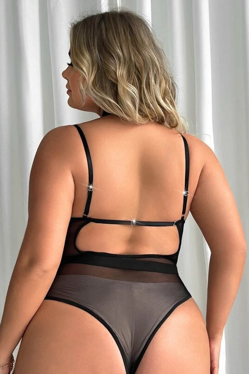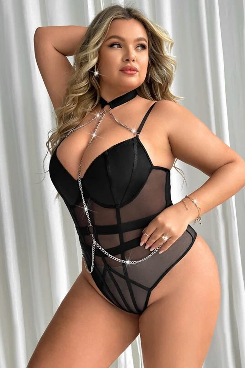 This black, plus size teddy features underwire cups, banded details, a high neck harness with rhinestone straps, and a cheeky back.