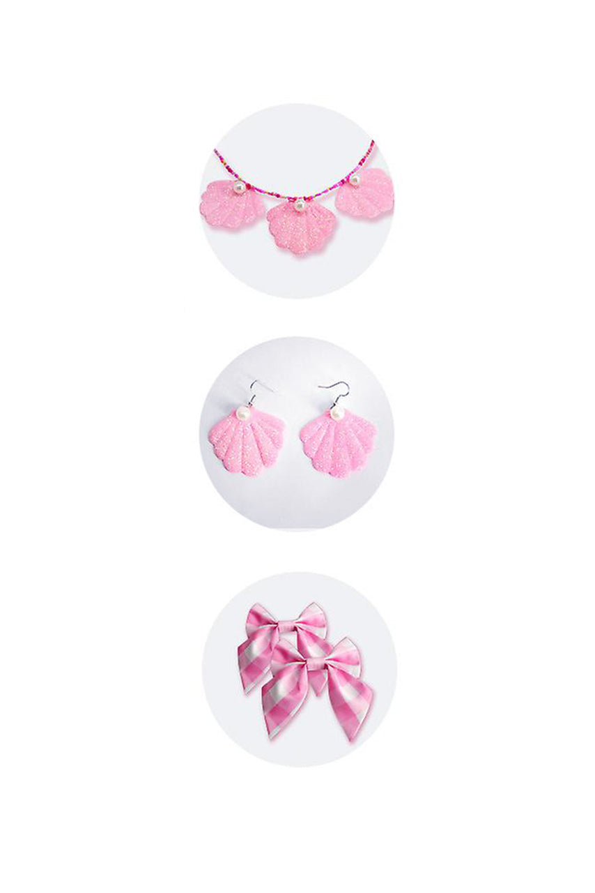 This plus size, Pink Gingham Beach Party Doll costume includes a pink gingham mini dress with a scalloped hemline, attached bow, hair bows, and seashell jewelry.