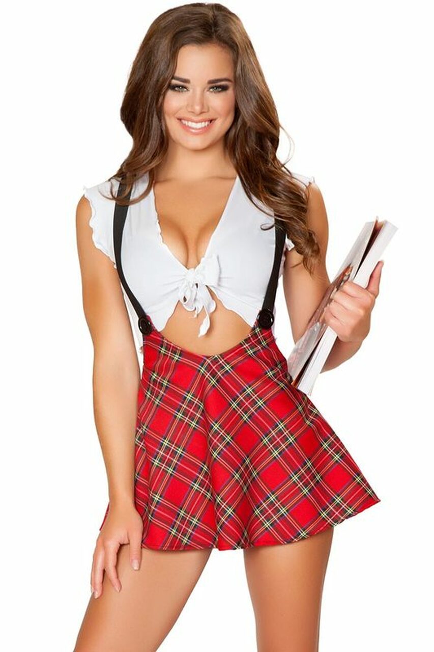 This two-piece Sexy Study Partner costume includes a white tie front crop top and a red plaid skirt with attached suspenders and a high waisted silhouette. (Stockings not included.)