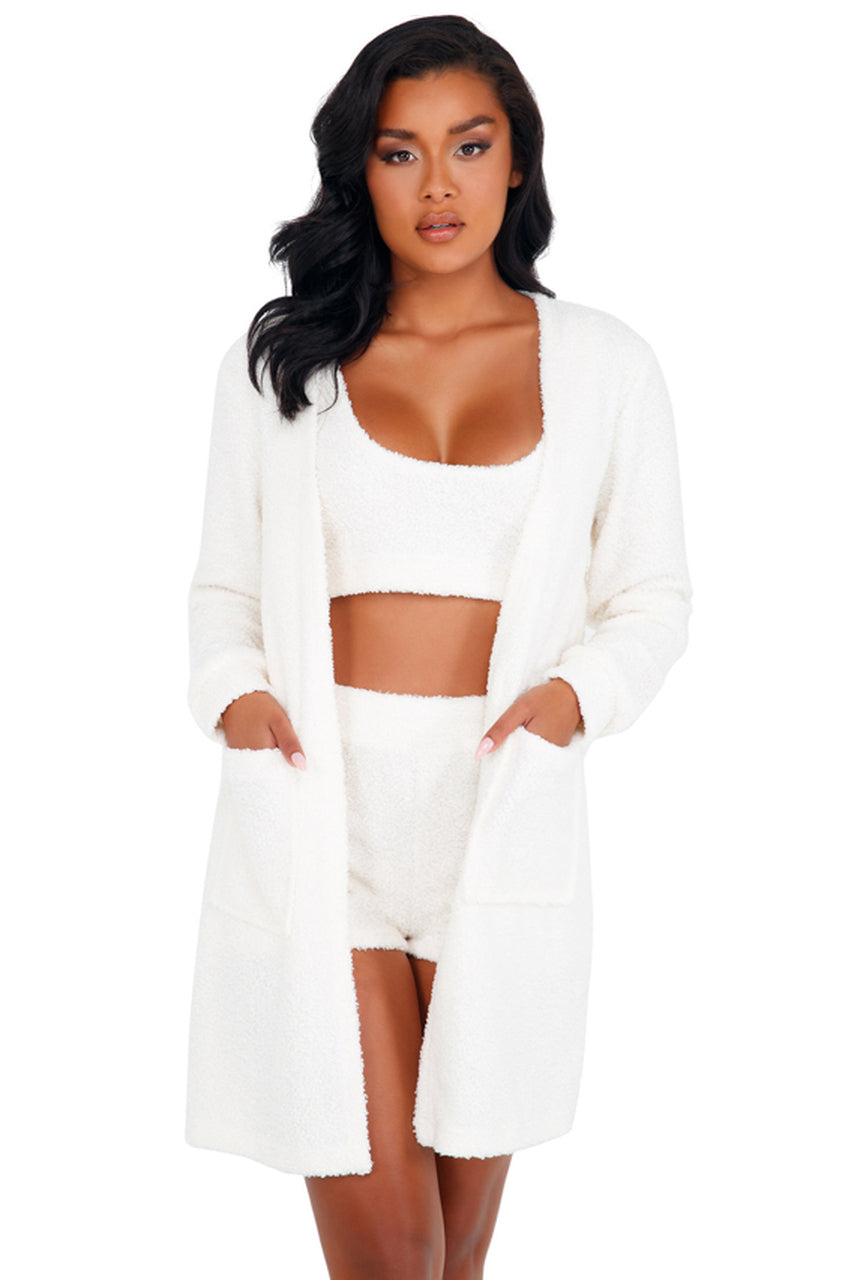 Cuddle up in this white cozy furry robe with pockets. (Includes robe only.)