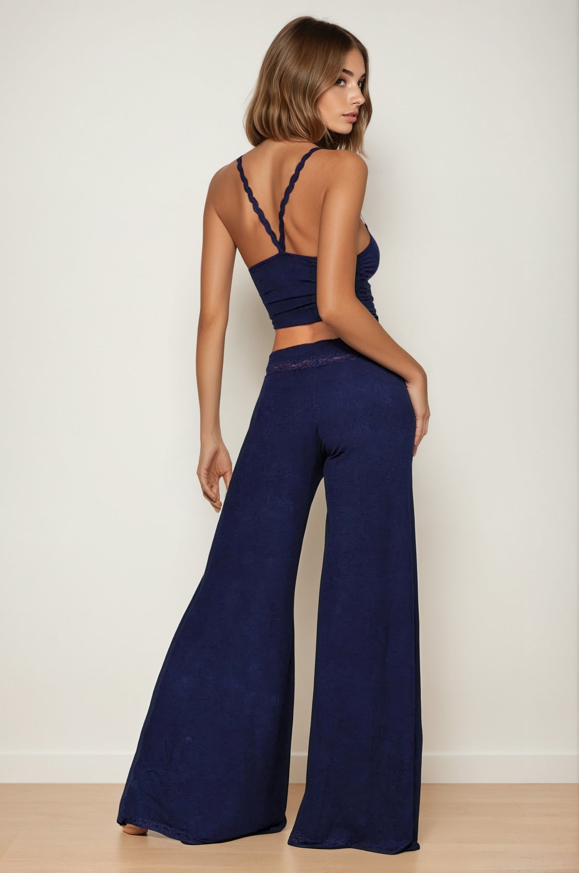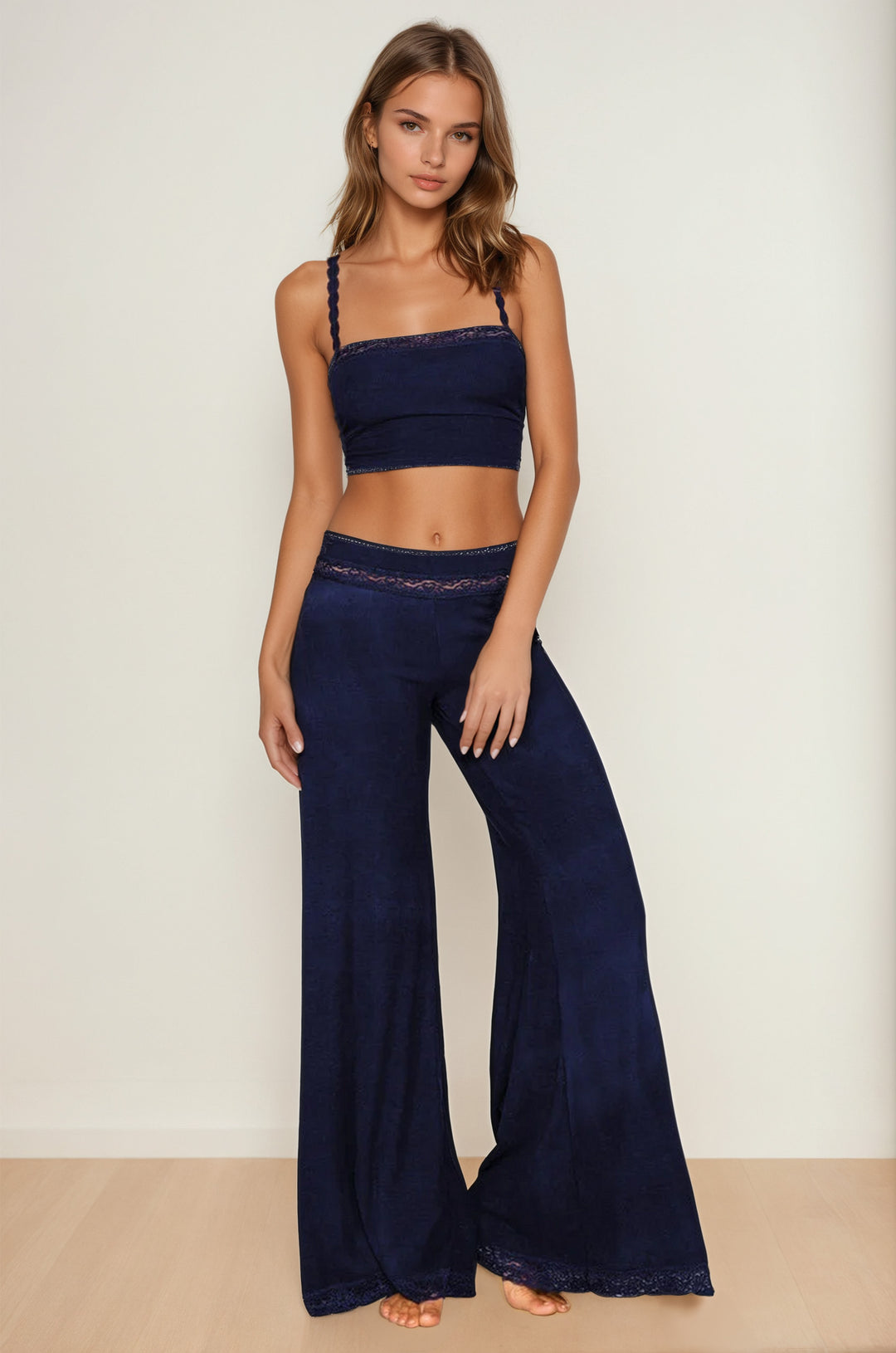 This soft, rib knit pajama set includes a navy crop top with lace trim and matching, full-length, wide leg pajama pants.