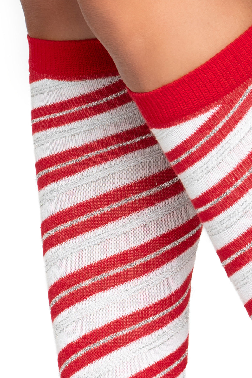 These red and white, candy cane striped knee high stockings feature a shimmery finish.