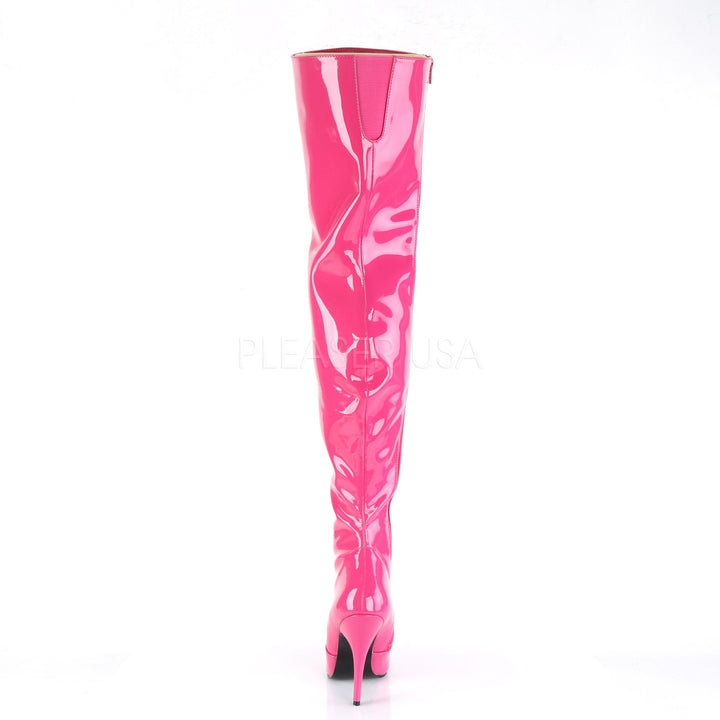 Women's hot pink 5 inch heel thigh high boots with a flat platform.
