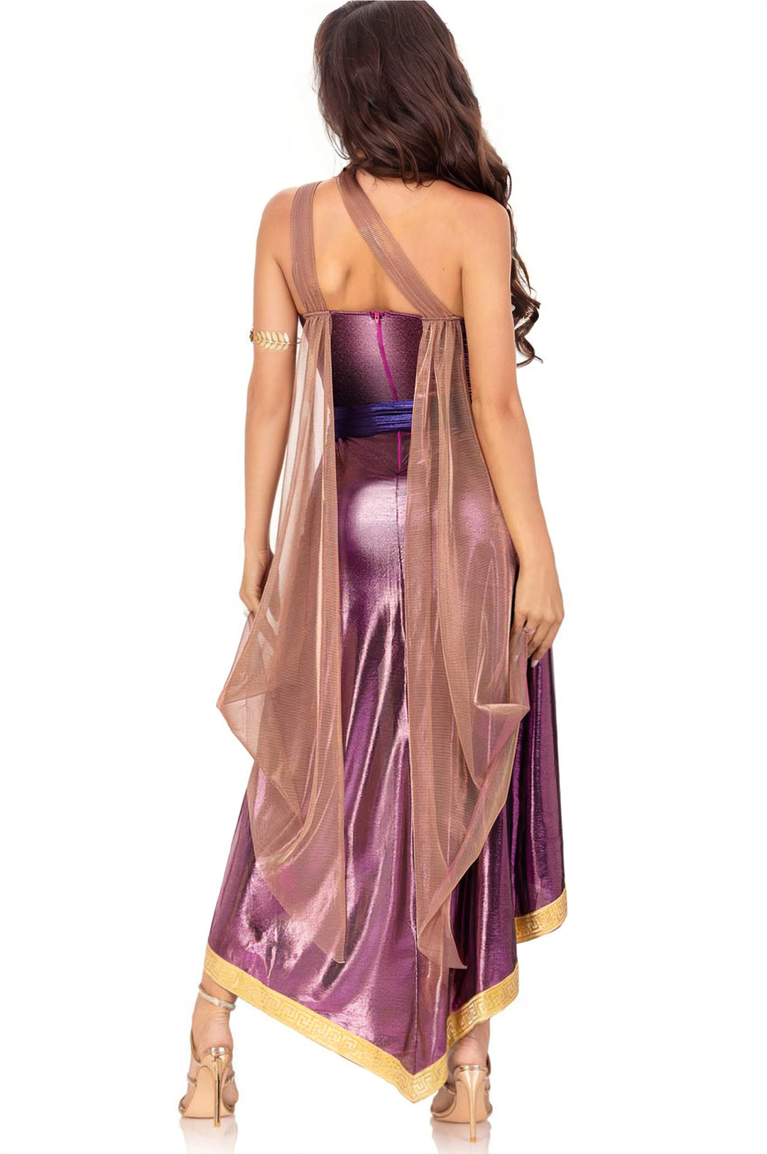 This four-piece, Amethyst Goddess costume includes an iridescent purple gown with a one shoulder silhouette, a cut out bust, gold trim, attached mesh drapes, a gold leaf waist sash, a blue waist sash, and matching head piece.
