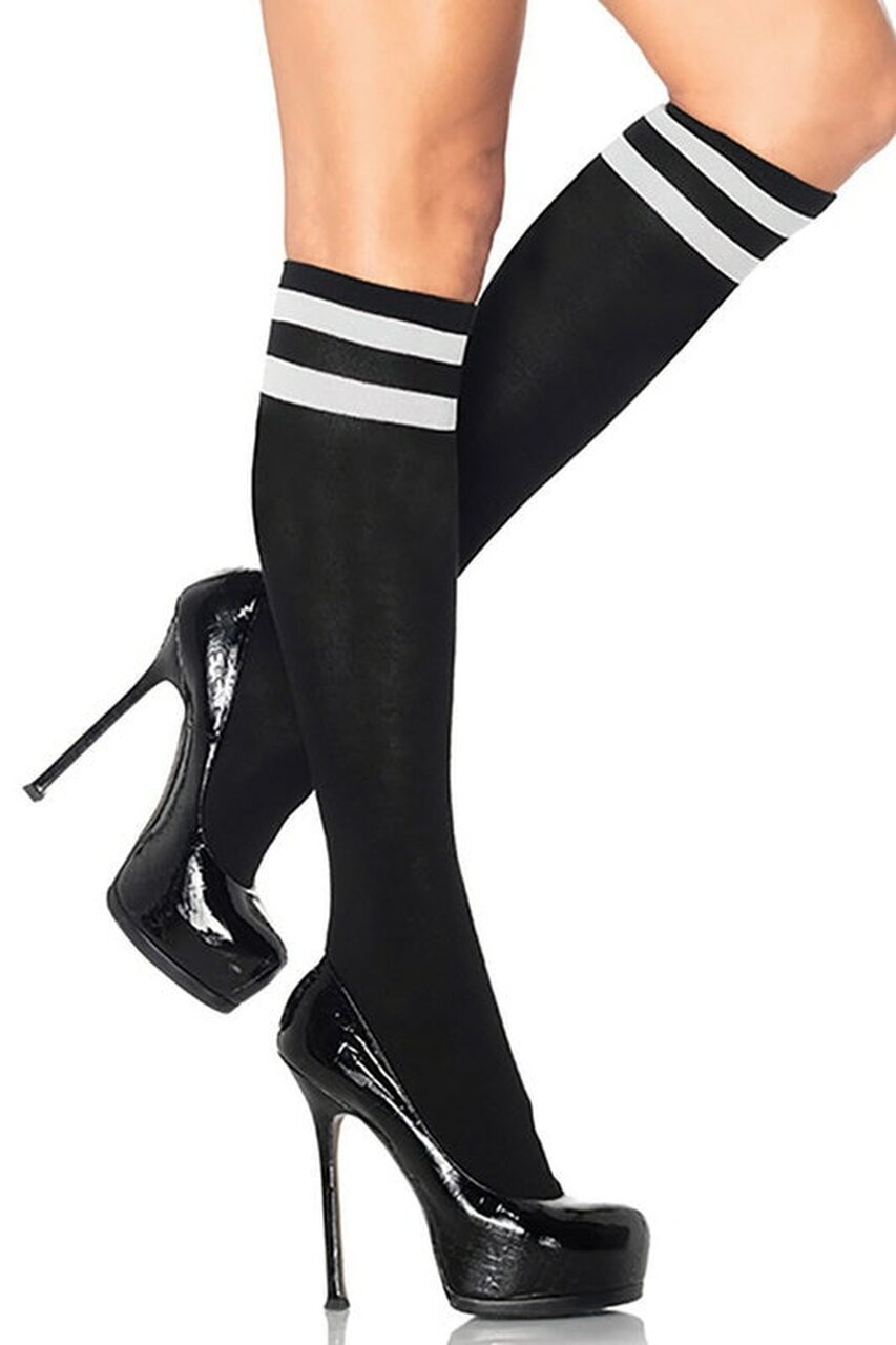 If you are looking for a sporty accessory to add to your sexy cheerleader ensemble or to go with your Wide Receiver Sexy Football Costume, you need look no further that these Athletic Knee High Socks. These knee socks are white socks with two stripes at the top, just at the knee. These stripes come in gold, black, blue, or green to match any outfit you want to pair them with.