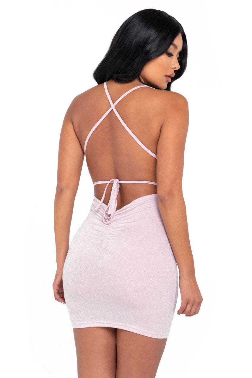 This sexy and sweet, baby pink glitter cocktail dress features a criss-cross front strap, a low cut bust, an open back with criss cross straps, and a cinched bottom.