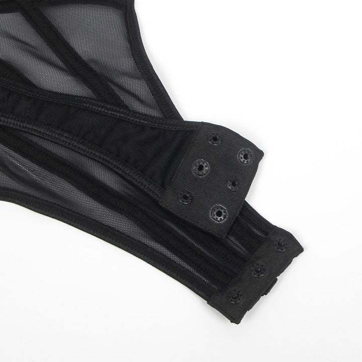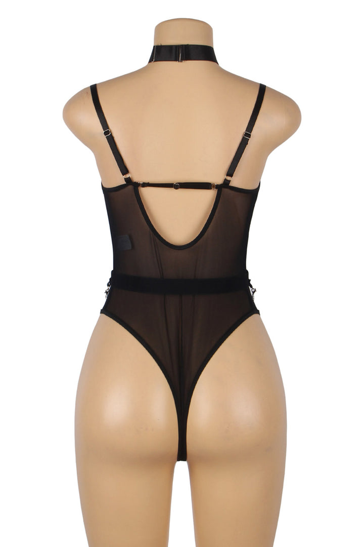 This black bandage bodysuit lingerie features a harness neck, draped chains, mesh inlingerie sets, and a cheeky back.