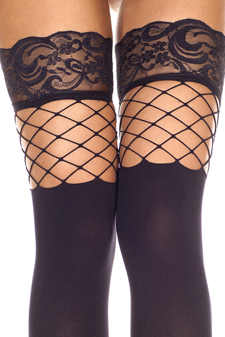 Explore unique hosiery including these featured Black Spandex Thigh High & Fishnets stockings. These black thigh high legging stockings feature black nylon stockings connected to soft black fishnet detail topped with delicate black floral lace.