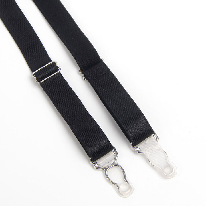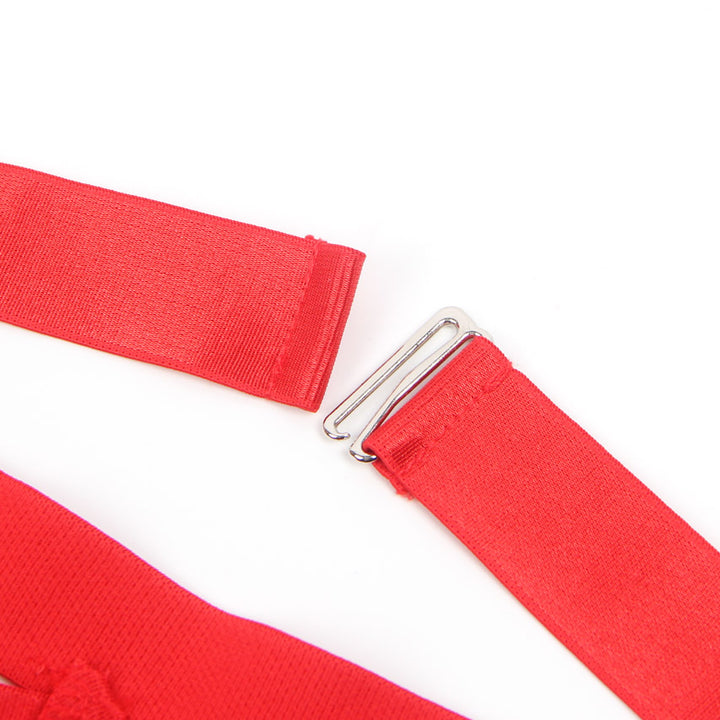This bondage set includes a strappy cut bra with adjustable straps, panty, and a matching strappy garterbelt with adjustable garter straps. (Stockings not included.)