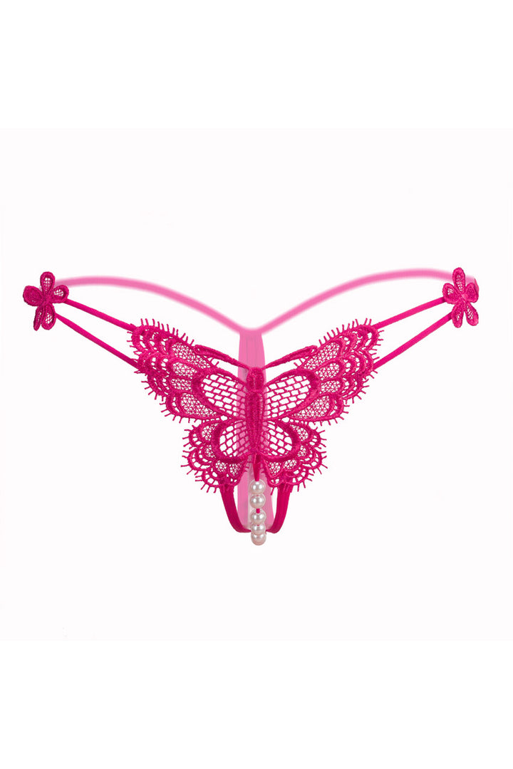 This flirty thong features an embroidered butterfly front, faux pearl string, and an open crotch.