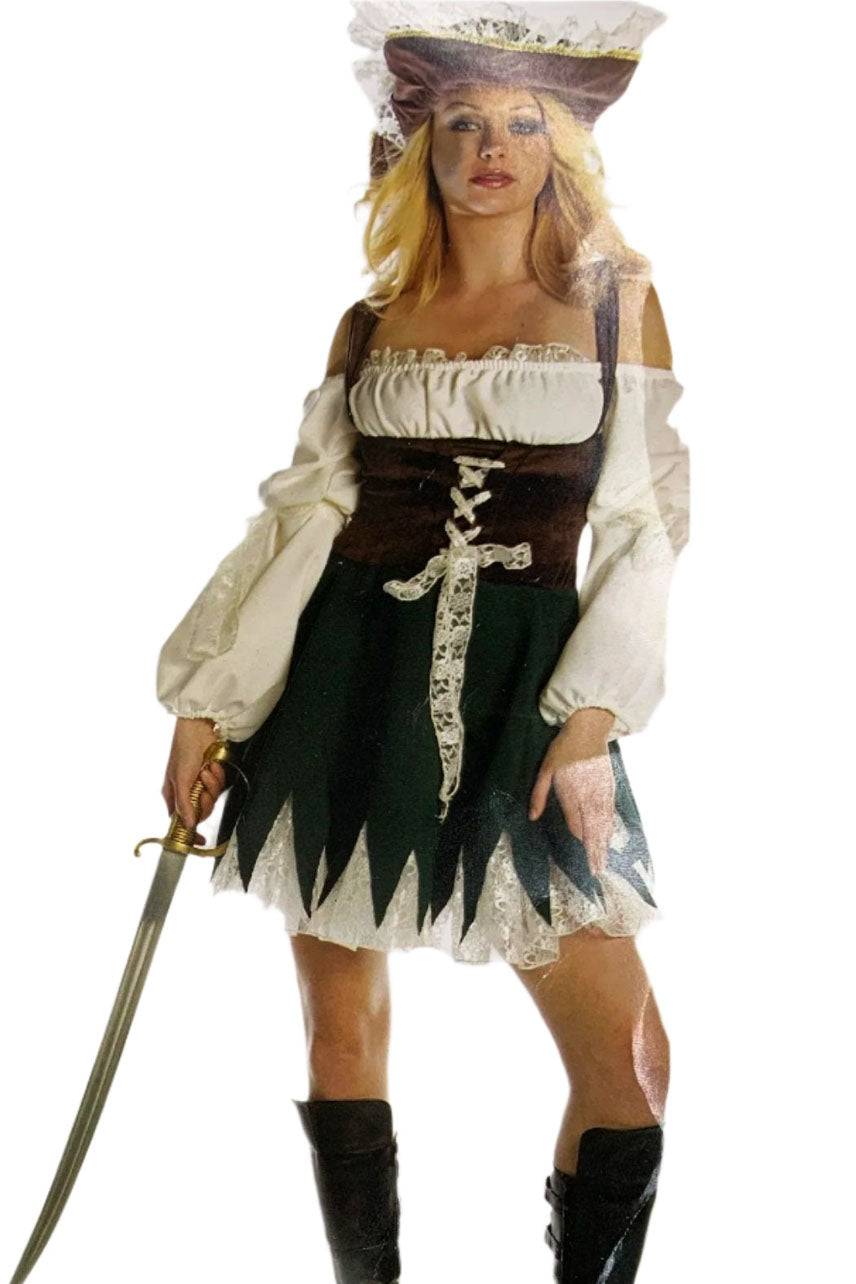Get ready to command attention in the Cabin Lass, a lace front mini dress with an attached petticoat for added flair. Detached sleeve ribbons add a playful touch. (Sword, hat, wig, and boots not included - get creative!) Take charge in style with this versatile dress.