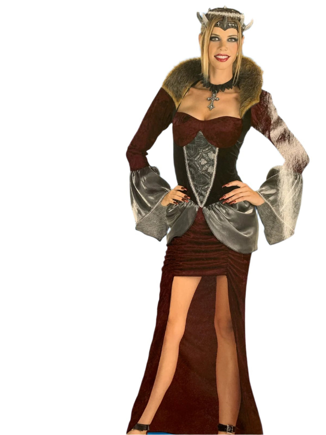 Rule over your kingdom with style in our Celtic Queen dress! This regal ensemble comes complete with a luxurious faux fur collar dress, elegant choker, and a fierce horn headpiece. Be the ruler of the party with this one-of-a-kind costume. (All hail the queen!)