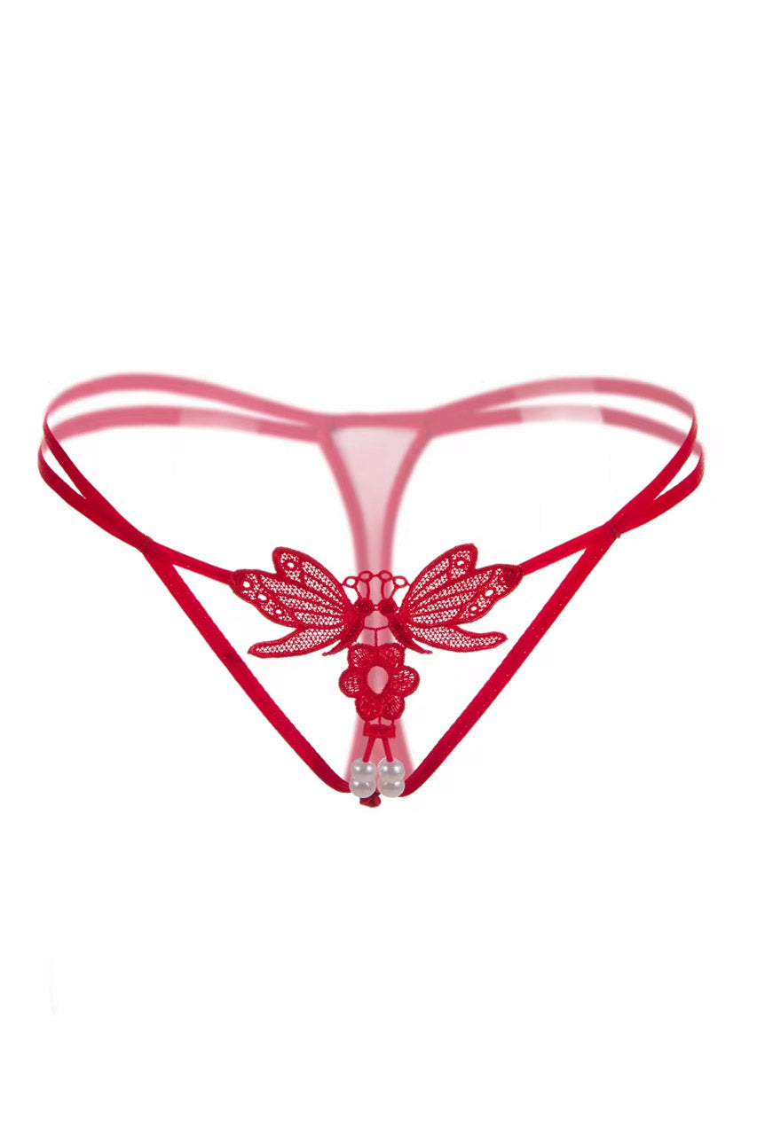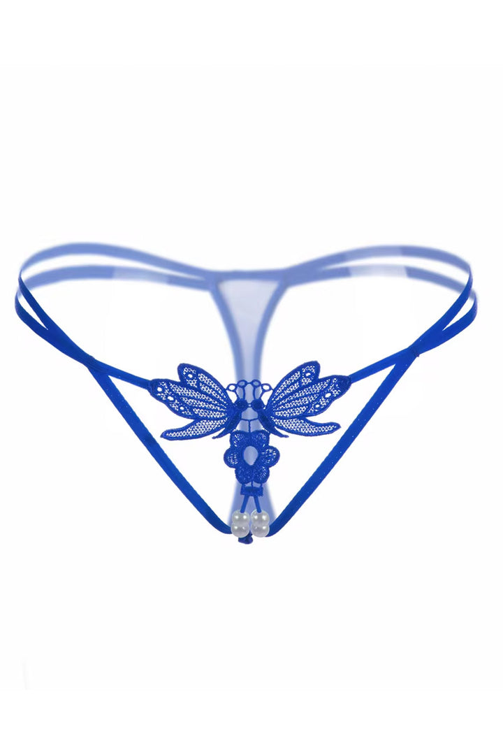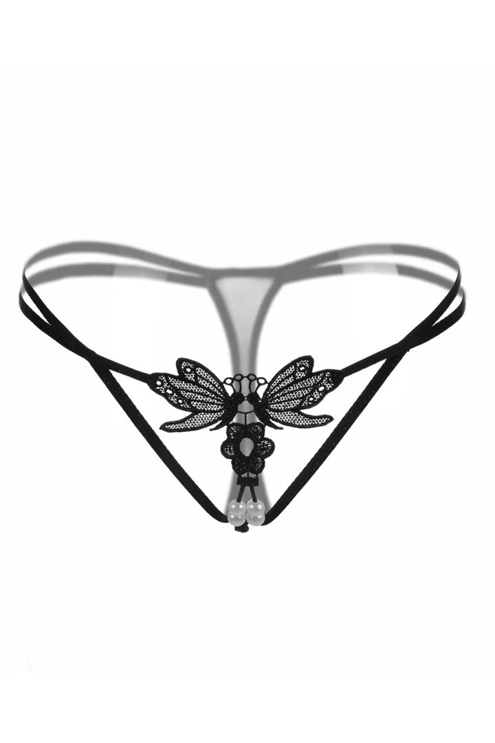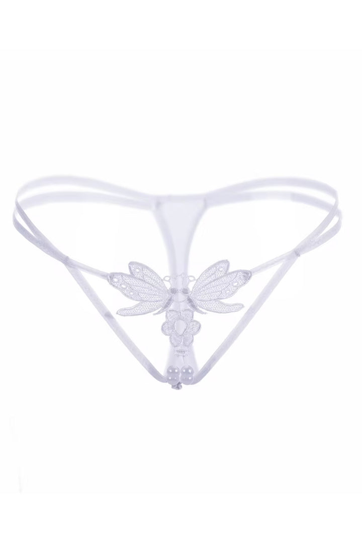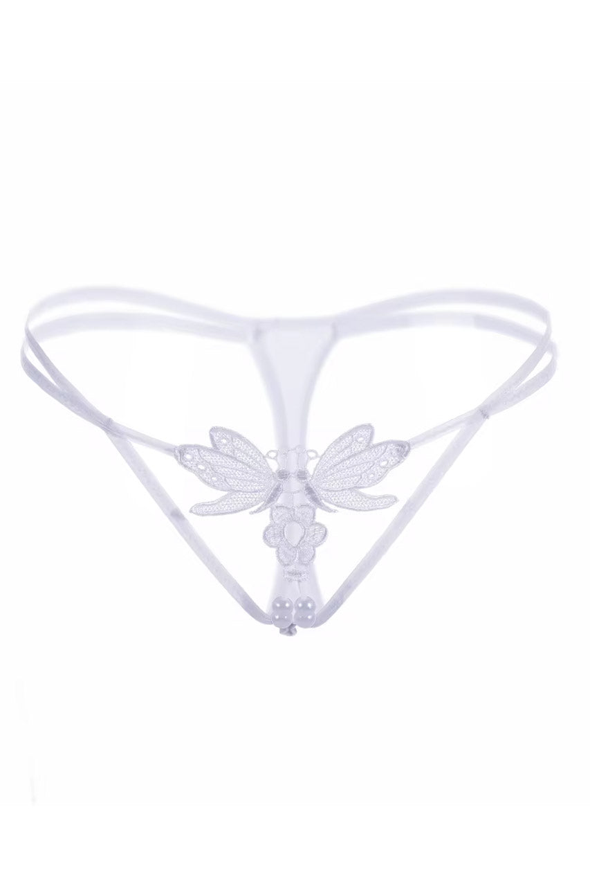 This strappy thong features a dragonfly detail and an open pearl crotch.