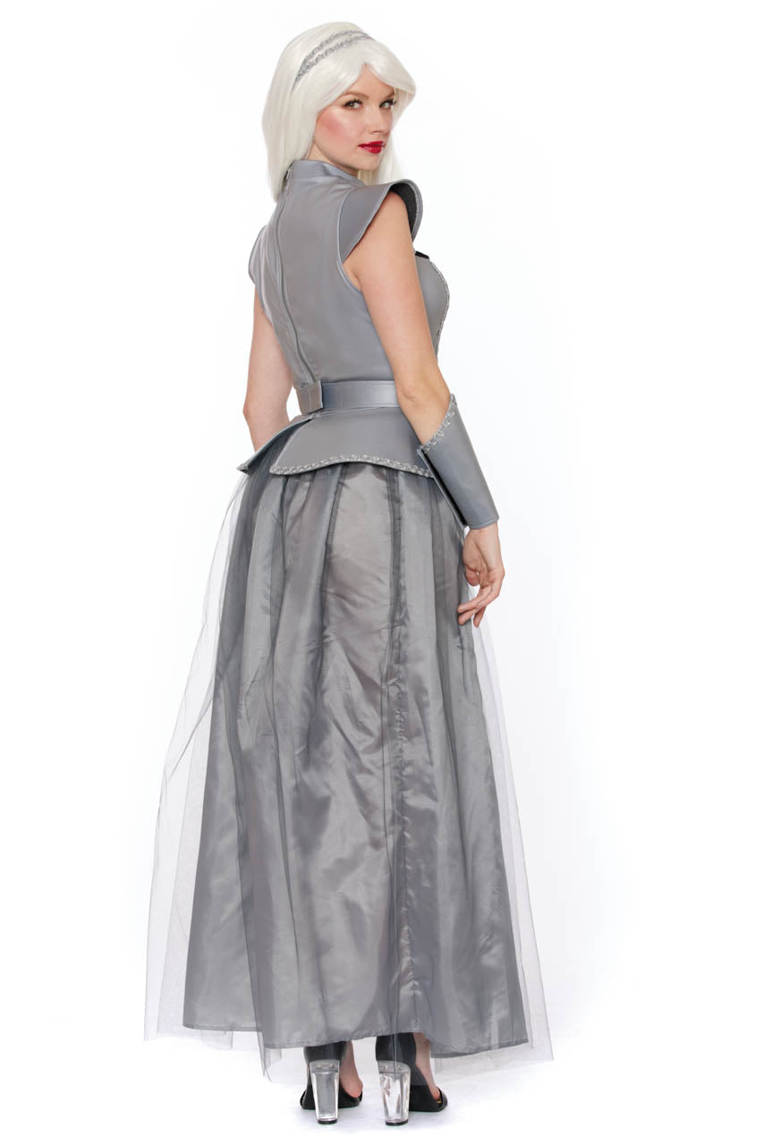 This Dragon Queen costume includes a vegan leather and velvet top with structured sleeves, shaped peplum, attached jewel, a tulle maxi skirt, braided headpiece, and wrist cuffs. (Wig not included.)