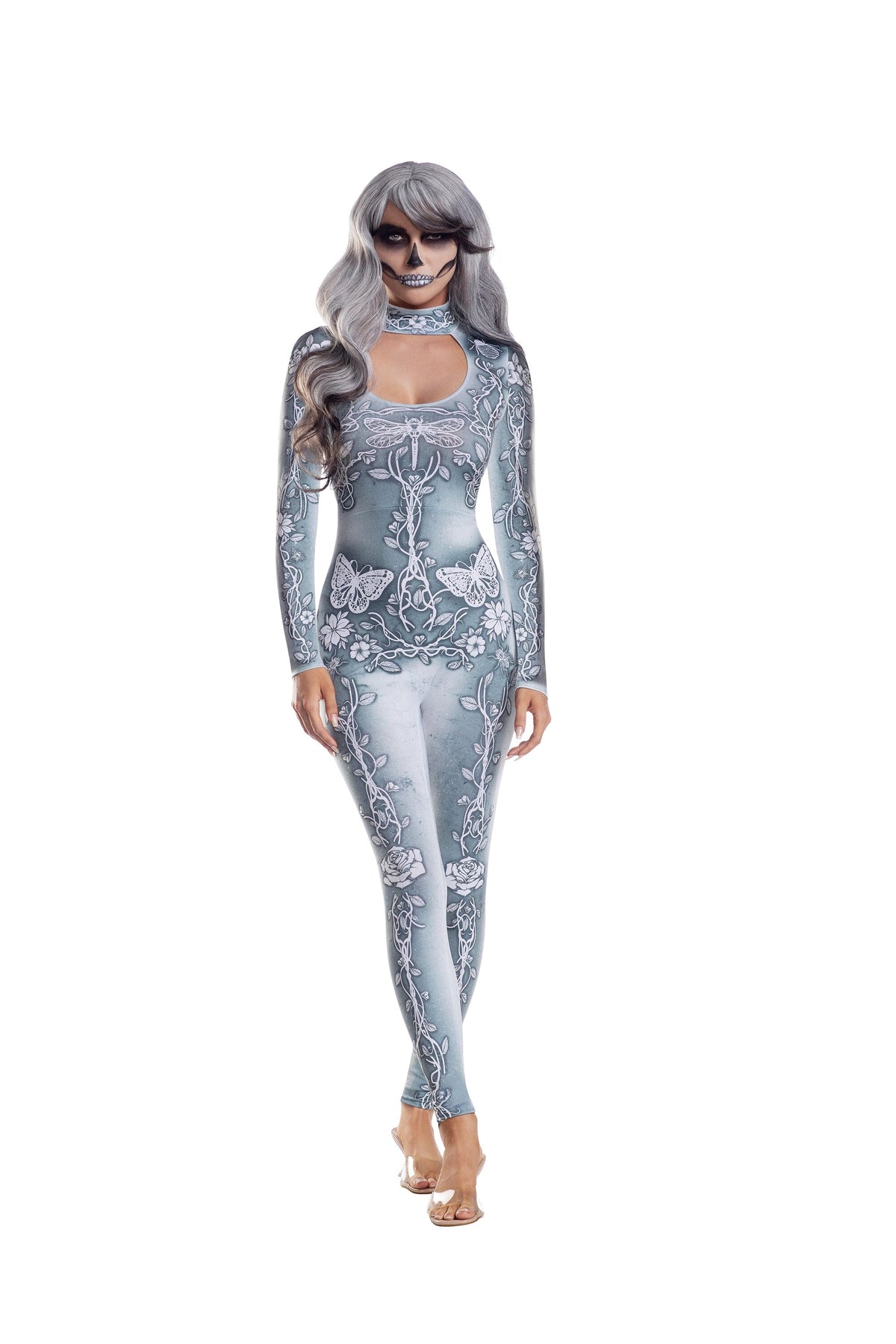 This Beautiful Bones jumpsuit features a vibrant sublimated skeleton print, a sleek, seamless fit for a modern, stylish look, long sleeves, and a cut out bust.