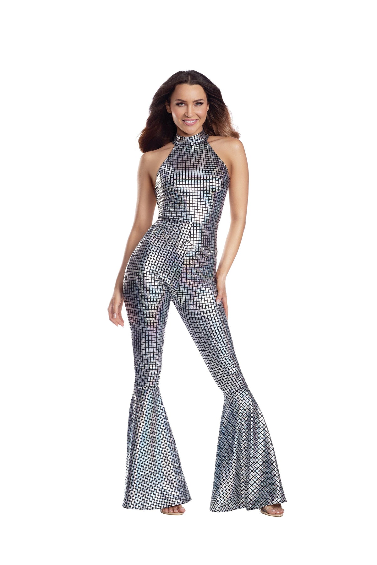 This Disco Diva costume includes an eye-catching foil-printed mock neck jumpsuit with flared, bell bottom pants.