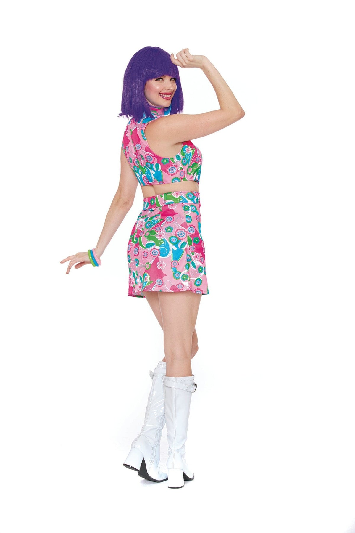 This Groovy Go-Go costume includes a 60s print mini dress with a mock neck, side cut outs, attached belt, and bangles. (Wig and earrings not included.)