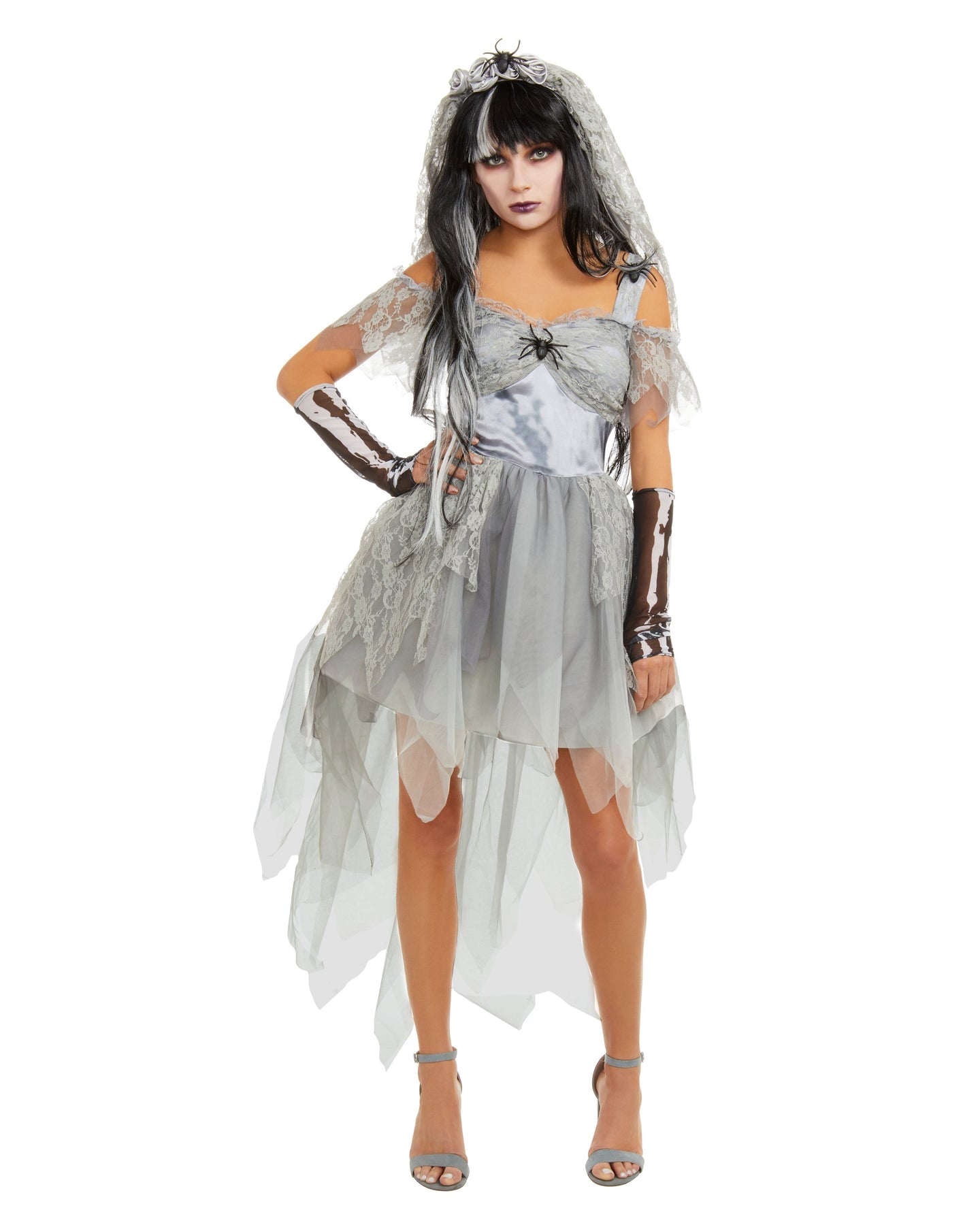 This Til Death Do Us Part Bride costume features a tattered mesh, off-shoulder style dress with intricate spider details, a mesh and lace veil with spiders and rosettes, and fingerless gloves featuring a skeleton print.