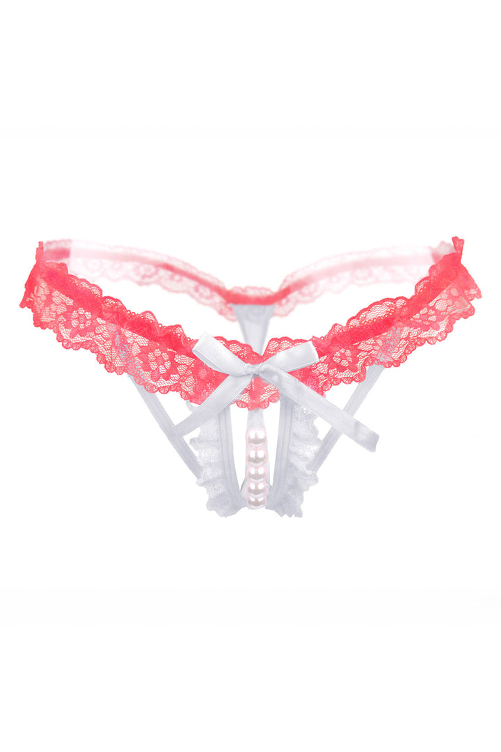 This flirty, ruffled lace thong features an open crotch with a pearl strap.