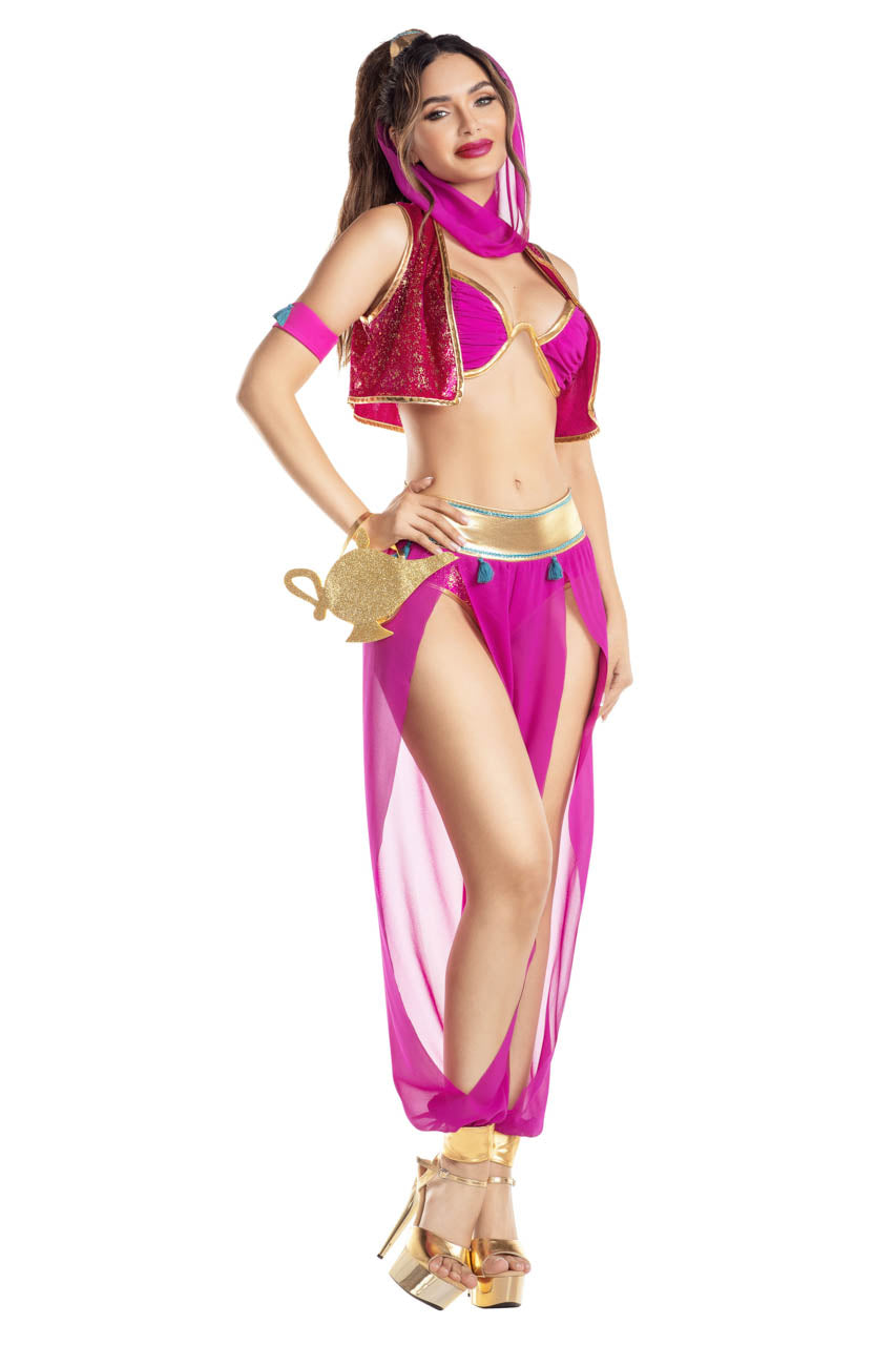 This Genie of the Lamp costume includes a magenta and gold foil velvet vest, a gathered chiffon bra with shiny aqua trim, aqua tassels, magenta chiffon flowy pants with built-in panty, a gold hat with chiffon drape, gold lamp purse, and armbands.