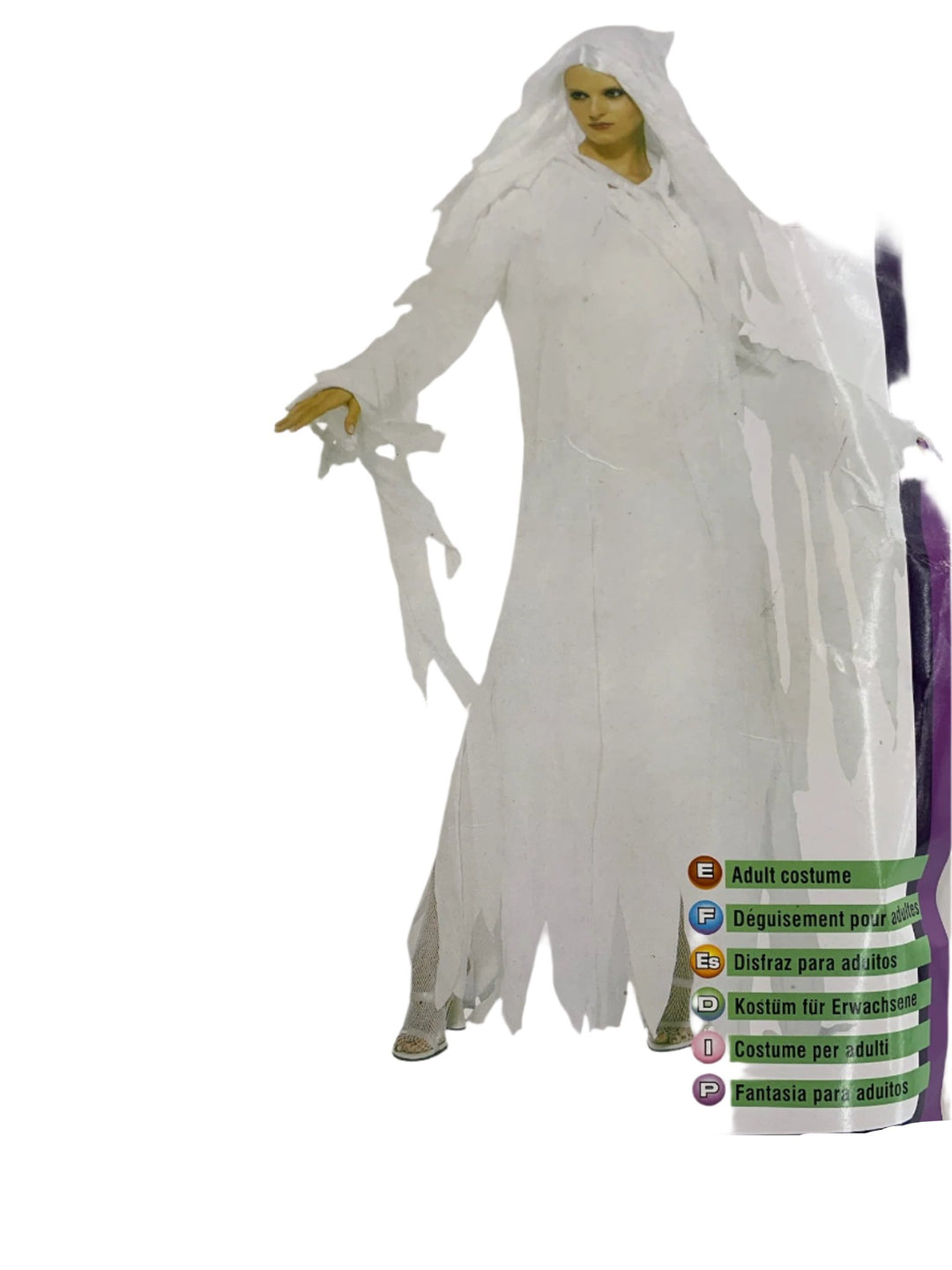 Transform into an ethereal being with the Ghostly Spirit costume! This hauntingly beautiful ensemble includes a wig, hooded gauze coat, and dress. Perfect for Halloween or any spooky occasion. (Boo-tifully eerie.)