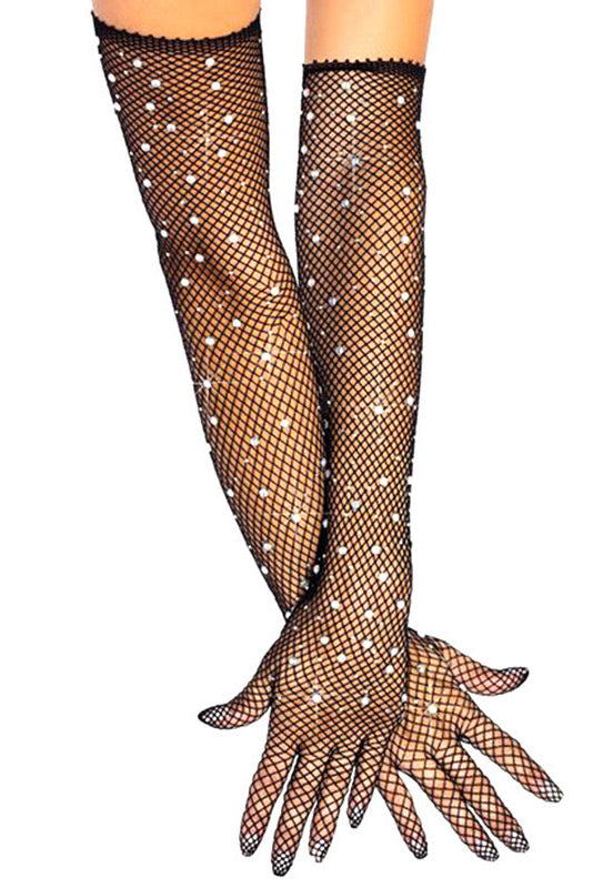 Complete your look with these elbow-length, fishnet gloves with glitter detail.