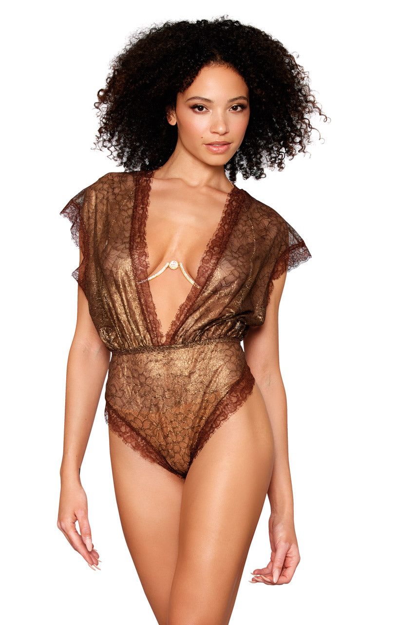 Elevate your intimate wardrobe with this stunning Gold Foil Blouson Teddy Set, designed to captivate and seduce. The luxurious gold foil finish catches the light beautifully, while the structured rhinestone-embellished metal underwire bra provides confident support and alluring definition. The blouson silhouette flatters your curves with its elegant draping, creating an irresistibly feminine look. Perfect for special occasions or whenever you want to feel absolutely radiant and desirable.