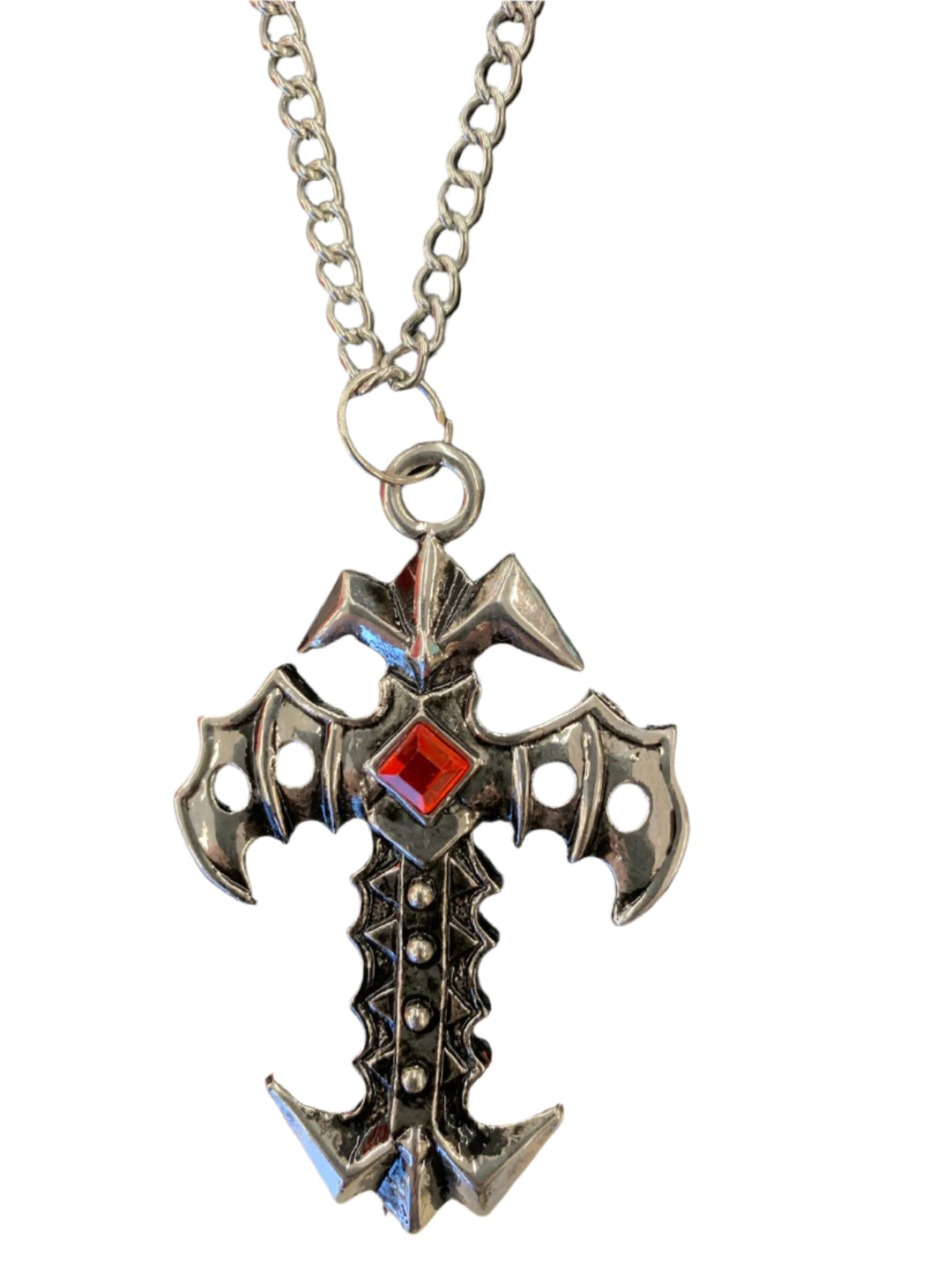 Add a touch of darkness to any outfit with our Gothic Cross featuring a bold red stone center of silver cross. Instantly elevate your style with this edgy accessory. (No vampires were harmed in the making of this product.)