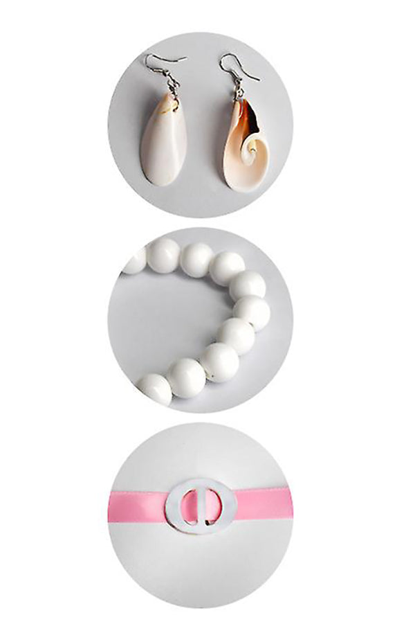This Green Beach Party Doll's Best Friend costume includes a green, fit and flair dress with pink trim, satin tie bow shoulder strap, faux belt, and seashell jewelry.