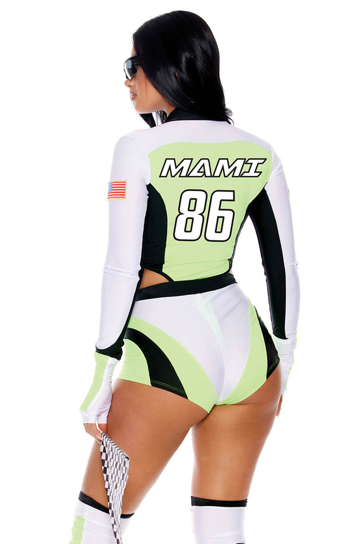 This five-piece, Green Light Go, sexy motocross racer costume features a mock neck, zip up bodysuit with MOTO print, high hip cut outs, long sleeves, racing patches, matching shorts, knee bands, gloves, and glasses. (Flag not included.)