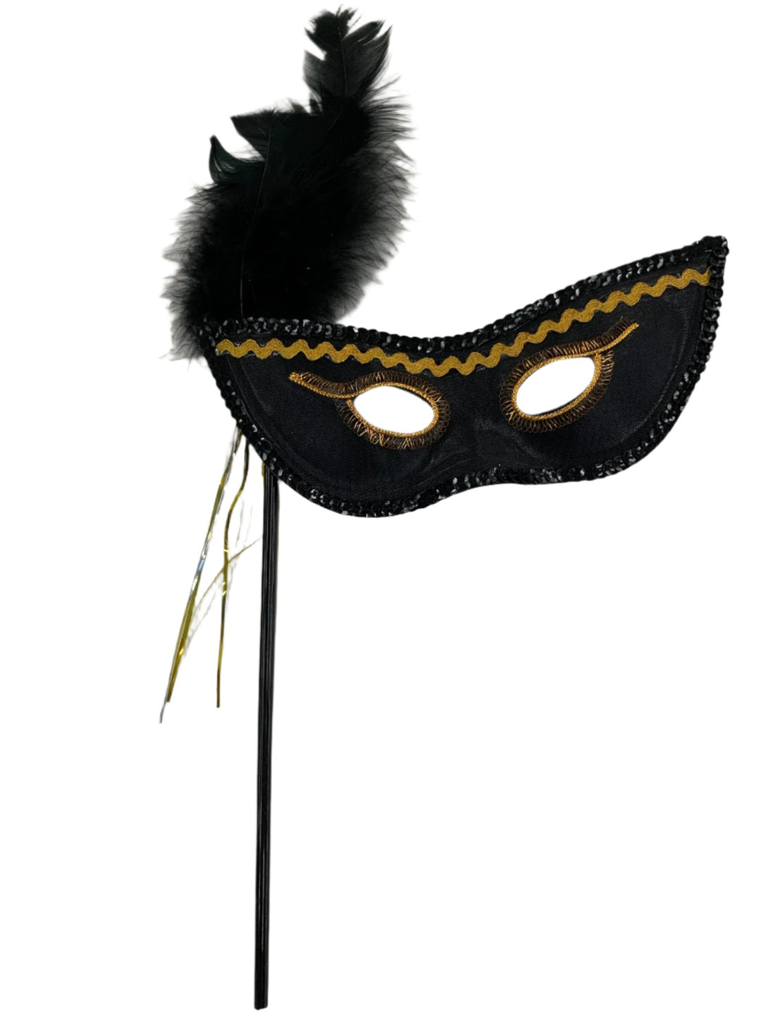 Introducing Hand Hold Masks - the ultimate accessory for any masquerade or costume party! These unique masks feature a delicate feather design for an added touch of elegance, as well as a convenient hand hold stick for easy posing. Plus, with a gold trim, you'll be the most stylish guest at the ball!
