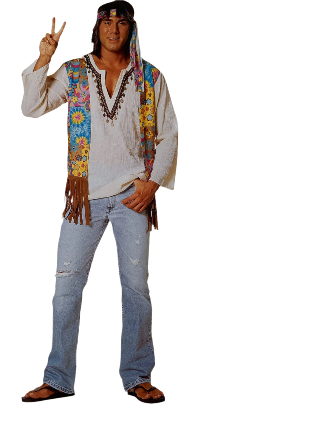 Feeling groovy? Say no more with our Hippie Dude Costume! Rock out to your favorite tunes in this far-out outfit. Spread peace, love, and good vibes at your next costume party while looking the part. Complete with all the psychedelic bells and whistles, this costume will have you feeling like a true flower child. (Jeans and flip flops not included.)