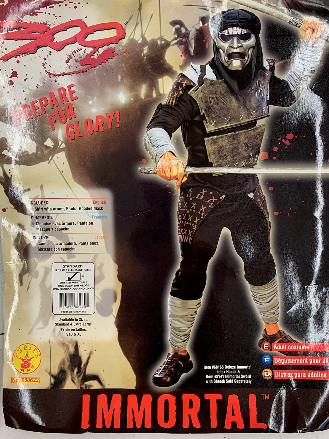 Unleash your inner warrior with Immortal! This complete outfit includes a shirt with armor, pants, and mask (sword not included). Perfect for any battlefield or party, conquer in style!