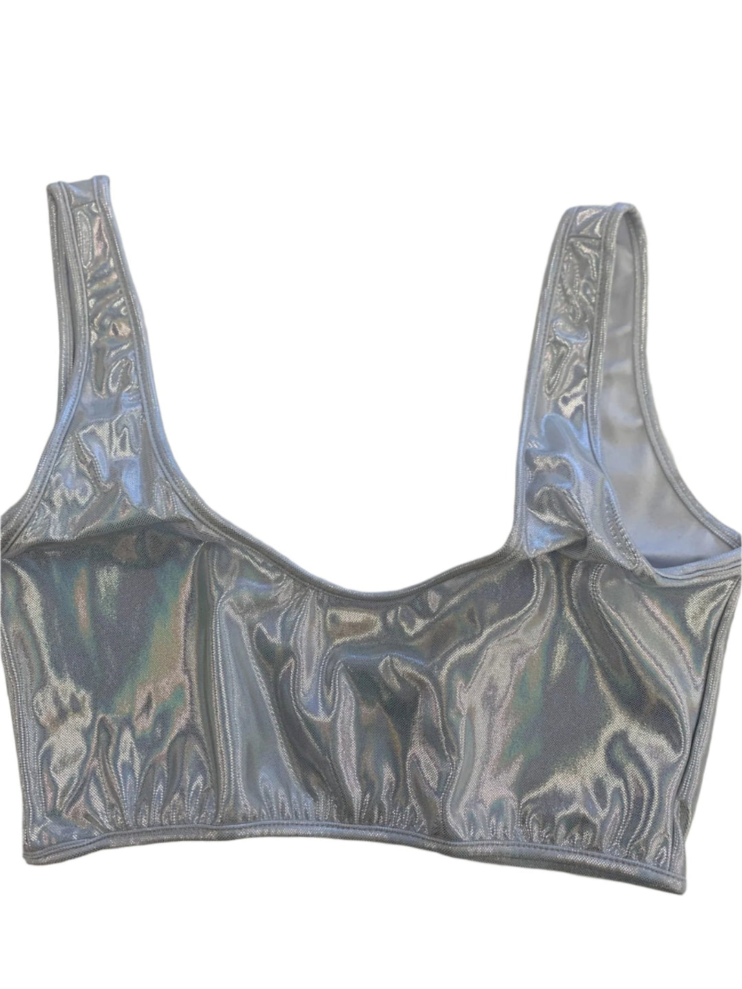Shine like a star in our Iridescent Silver Crop Top! The shimmer stretch material adds a touch of cosmic glamour while the crop top style keeps you looking effortlessly stylish. With a simple back band and scoop back, this top is out of this world!