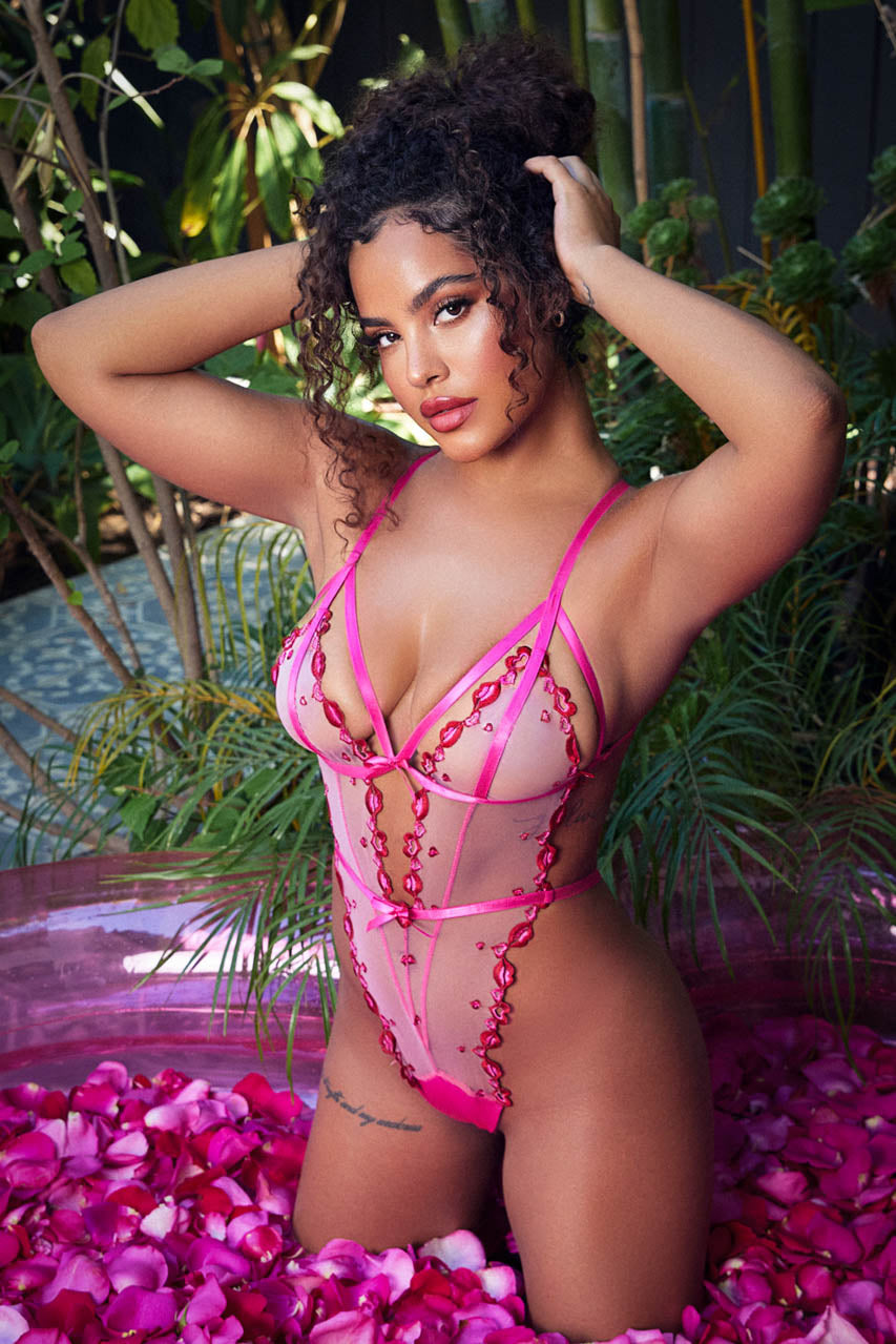 This flirty, Kiss and Tell teddy lingerie features a pale pink mesh, high cut hips, strappy bust, satin ribbon detail, heart and lip embroidered trim, string back, and cotton guslingerie set.