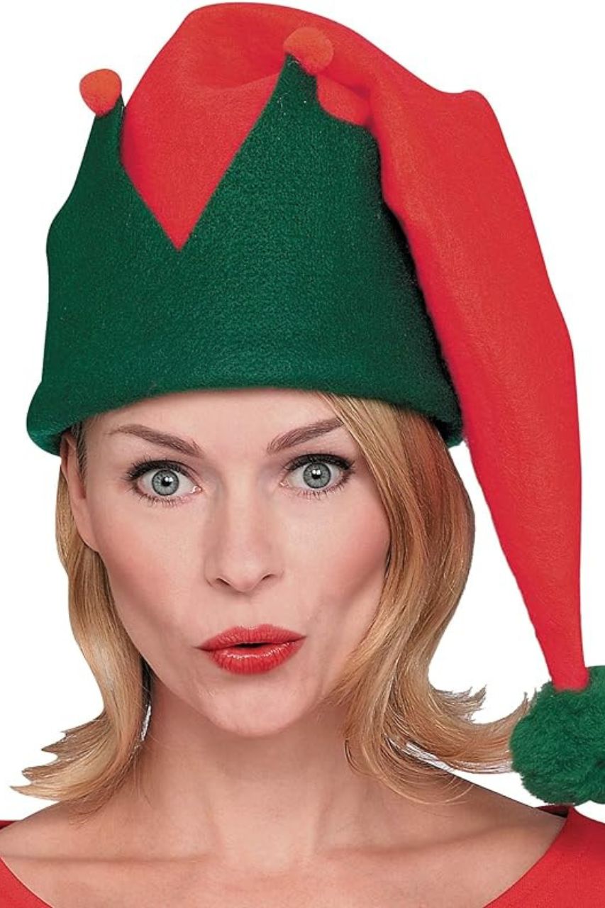 This festive Christmas hat has a classic red and green color scheme, with playful pom-poms adorning the point and brim.