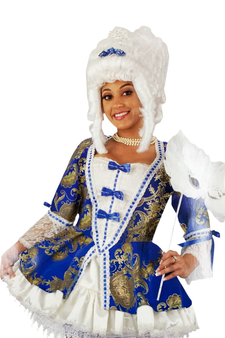 Be the queen of the party with our Marie Antoinette dress. Made of luxurious Royal Velvet and adorned with gold Jacquard print, it's fit for royalty. The bone satin and lace add an elegant touch, while the satin ribbon trim adds a playful twist. Perfect for a regal yet whimsical look! (Wig, Mask, Petti Coat & Neckless not included.)