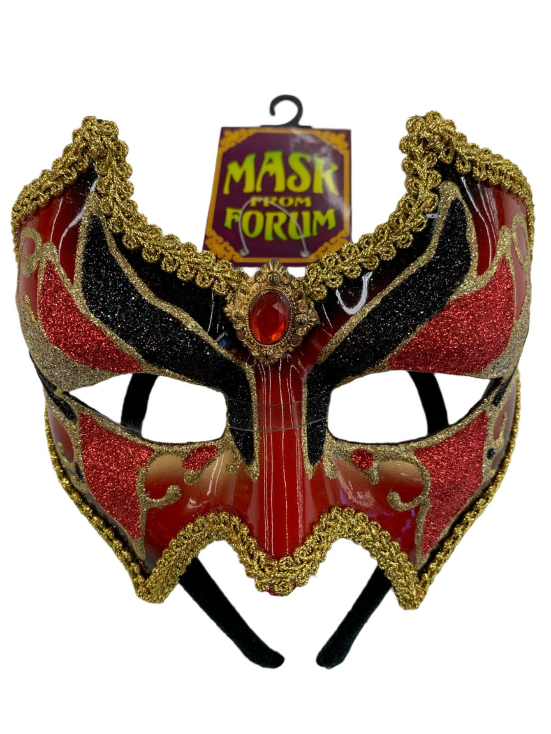 Get ready to rock any party with our red, black, and gold mask! With a mesmerizing red glass jewel in the middle, you'll be the center of attention. Add a touch of mystery and glamour to any outfit with this must-have accessory. (Jewel is only for show, not magic powers included!) 🎉