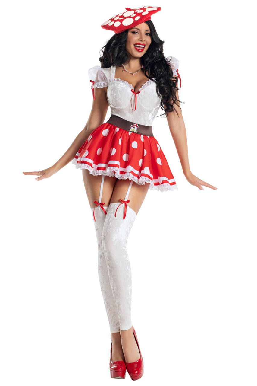 This Mushroom Cutie costume includes a white, crushed velvet teddy with white mesh puff sleeves, attached garters, red ribbon details, a matching polka dot skirt with mushroom patch detail, a mushroom hat, and leg warmers.