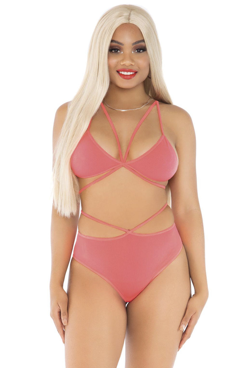 This two-piece lingerie set includes a neon opaque, cage strap bra top with a matching strappy Brazilian cut panty.